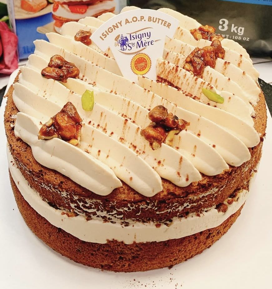 自製的焦糖與鮮奶油做成的香緹,夾在巧克力蛋糕中,與焦糖化的香蕉一起,