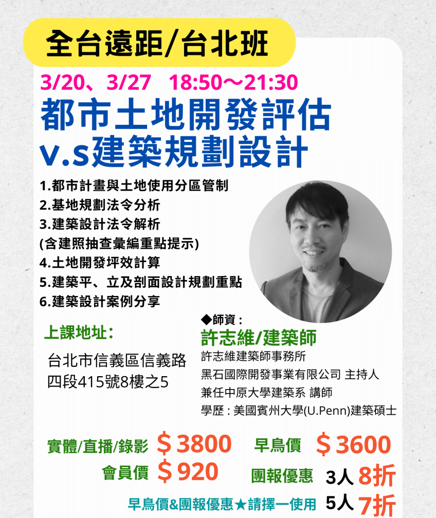 【台北實體開課/ 全台遠距教學】4/21起「都市土地開發評估v.s建築規劃設計」