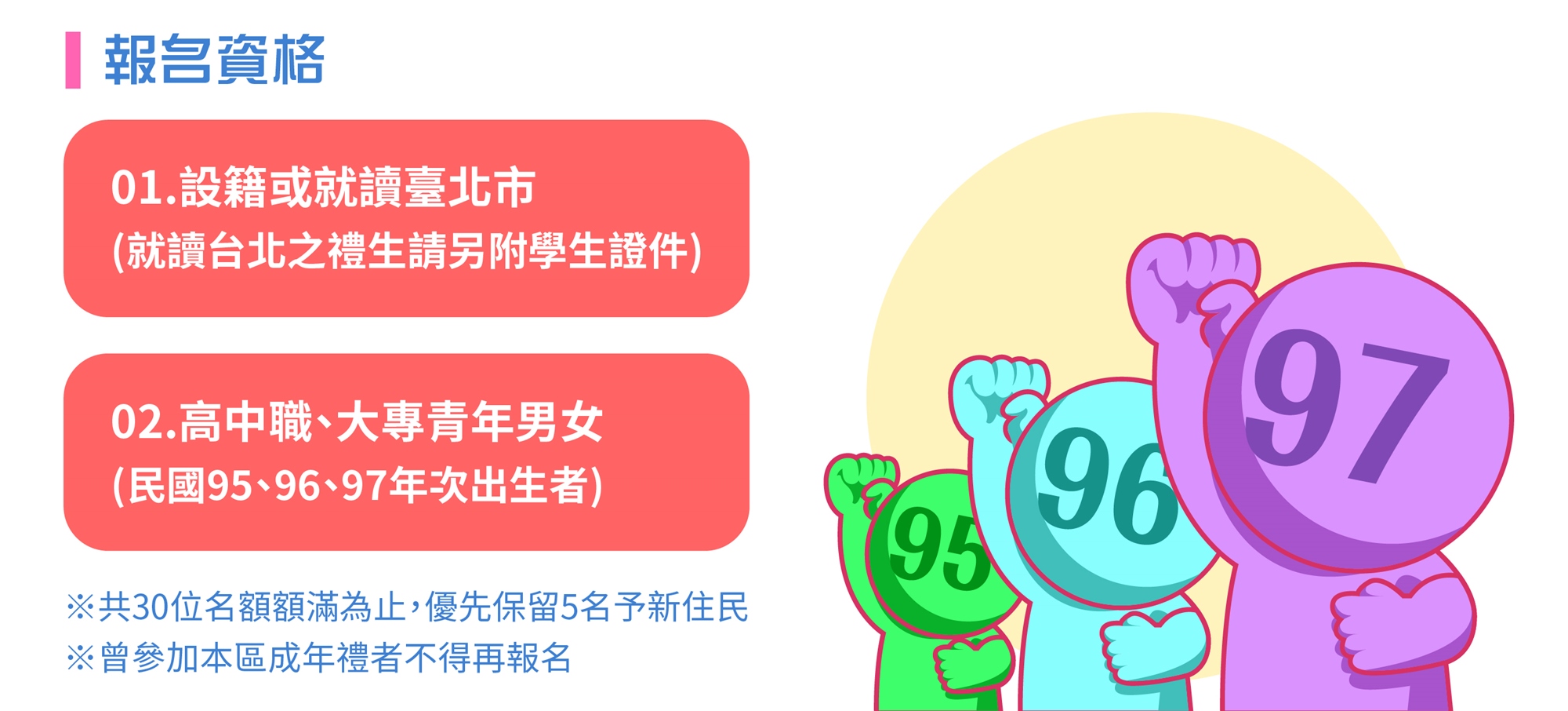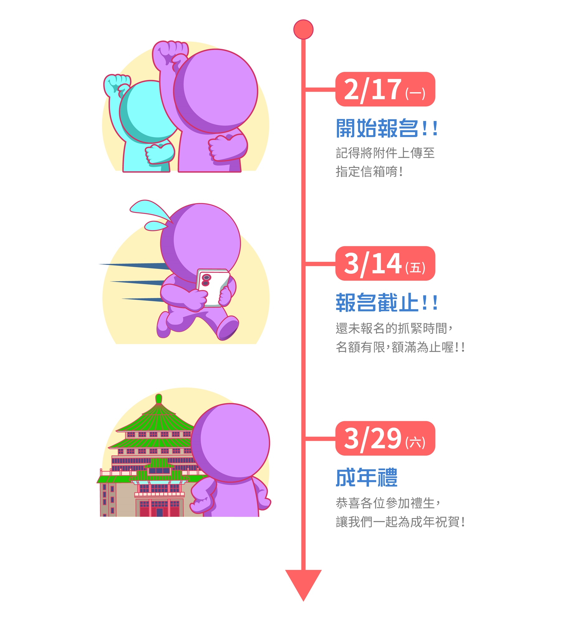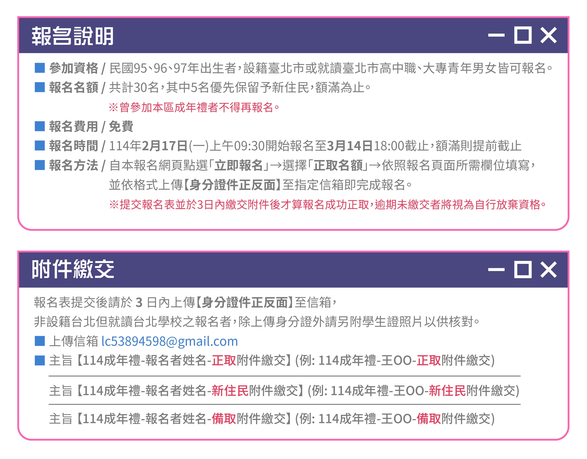 3、資料繳交指定信箱為「lc53894598@gmail.com」(英文為小寫LC),主旨【114成年禮-報名者姓名-組別附件繳交】(※例如:114年成年禮-王○○-正取附件繳交)