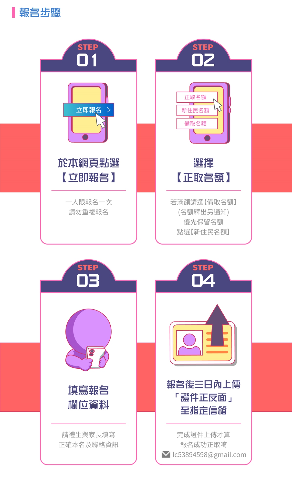 1、完成線上報名之後,以【設籍資格】報名者需於三日內完成繳交「身分證件正反面」;以【就讀資格】報名者,則需上傳「學生證正反面」以供核對。逾期未繳交者將視為自行放棄資格。
