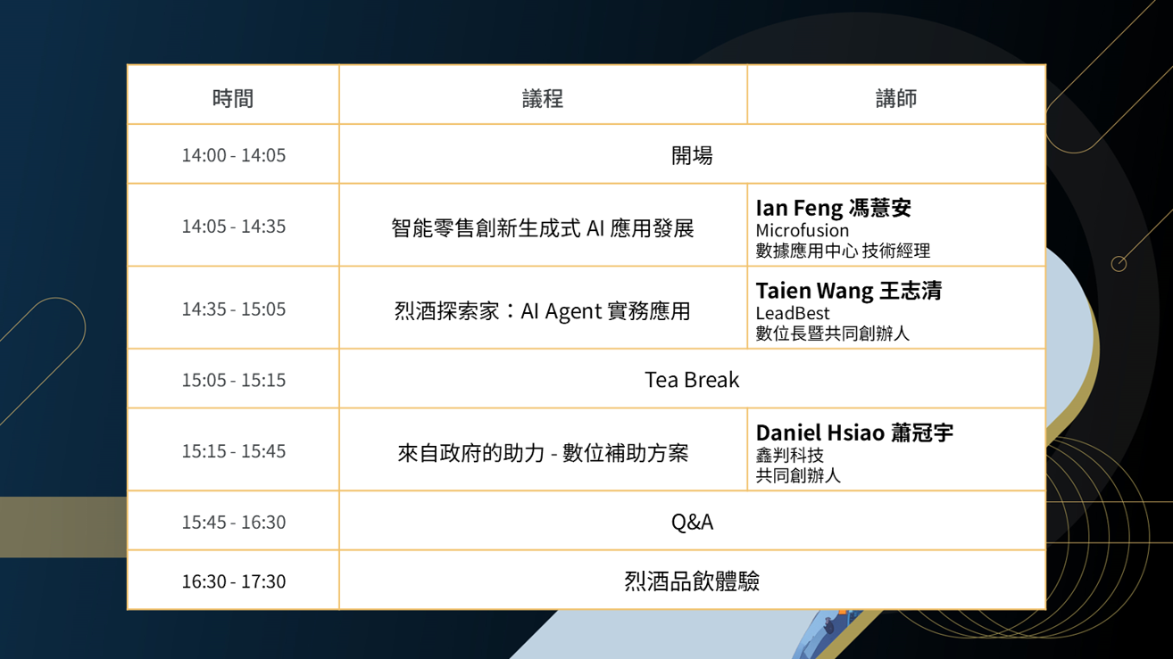 本次活動為對 AI 技術與創新應用感興趣的企業人士,提供一個專業交流與合作洽談的平台,透過產業專家的深度剖析與實務案例的分享,幫助企業開拓新視野、找到與自身業務發展契合的解決方案!