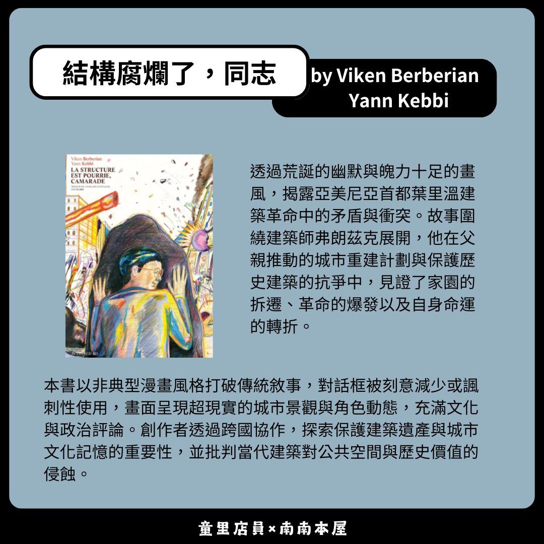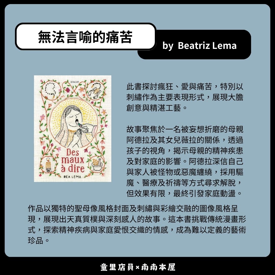 雖然有出攤南漫節(12/14-15 @西竹圍之丘文創園區),但市集時間很短(13-17)且沒椅子坐,再加上店員可能會去開小差無法好好待位置上好好介紹,且每本書都值得漫漫慢慢看,想著反正下攤時間還很早,決定在市集結束的晚上及隔日,將書帶到南南本書(位於武聖夜市旁的複合式獨立書店),讓更多人有機會看到童里帶來的這些厲害的歐陸漫畫與圖像小說!