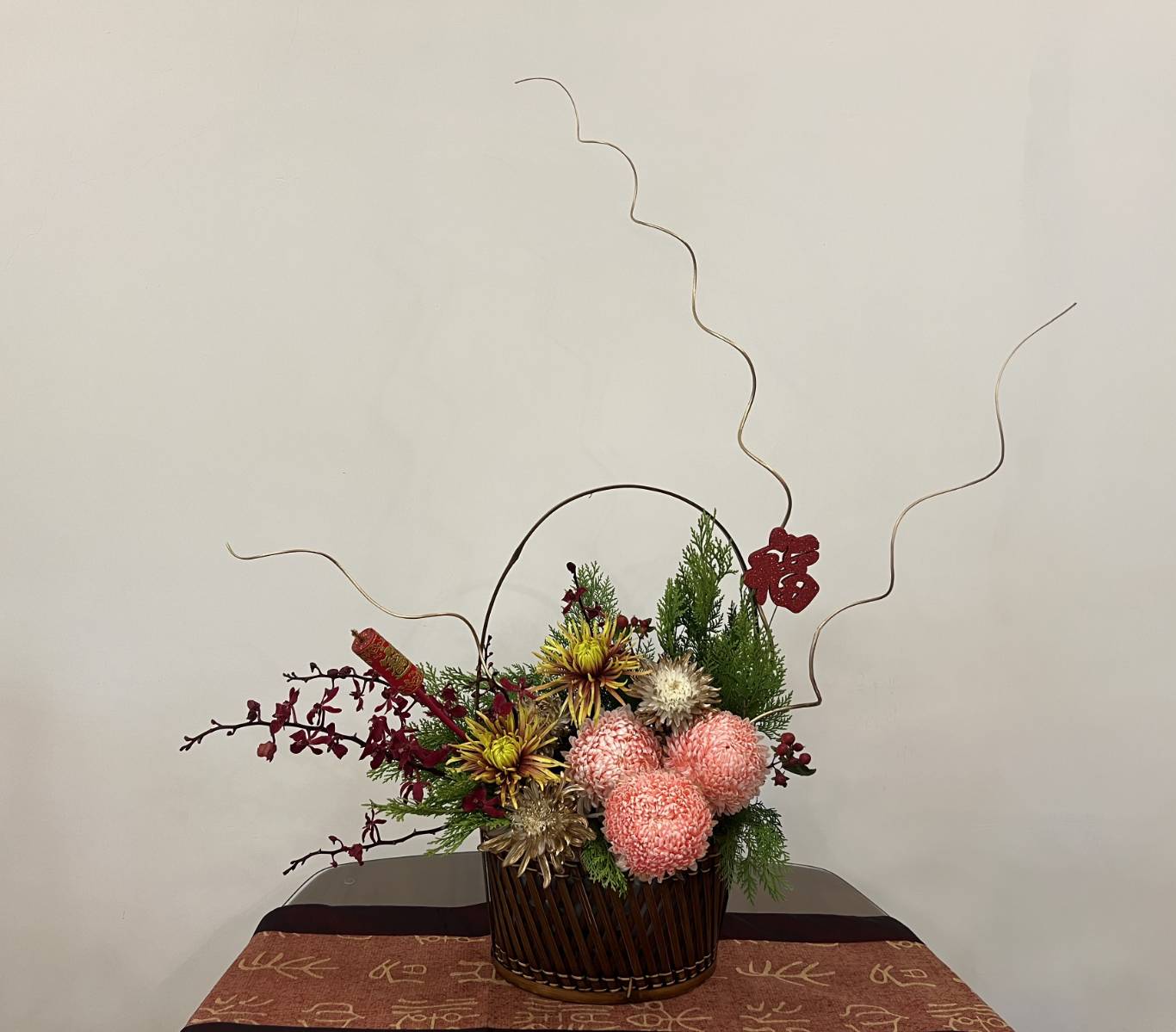 整體作品皆以有吉祥寓意的花材組成大器主體,視覺上更以線條表現出似龍似雲的感覺,整體吉祥紅、長青綠以及貴氣金色,有著熱鬧過年氣氛。