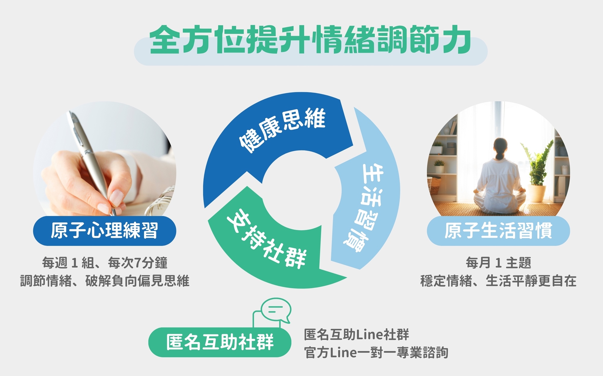- 每週提供1組『情緒調節』心理練習,每月共4組,每次練習只要7分鐘,可重複練習深化效果。