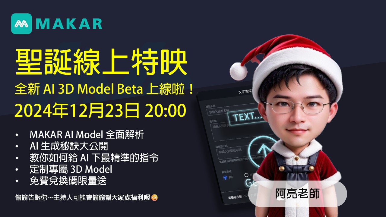 MAKAR 特別推出AI 3D Model 快閃小課程,邀請您搶先體驗新功能!課程中,除了深入了解 AI 3D Model 的操作秘訣,我們還準備了阿亮大神的 AI 專業“施法咒語”,助您打造創意滿分的數位內容!