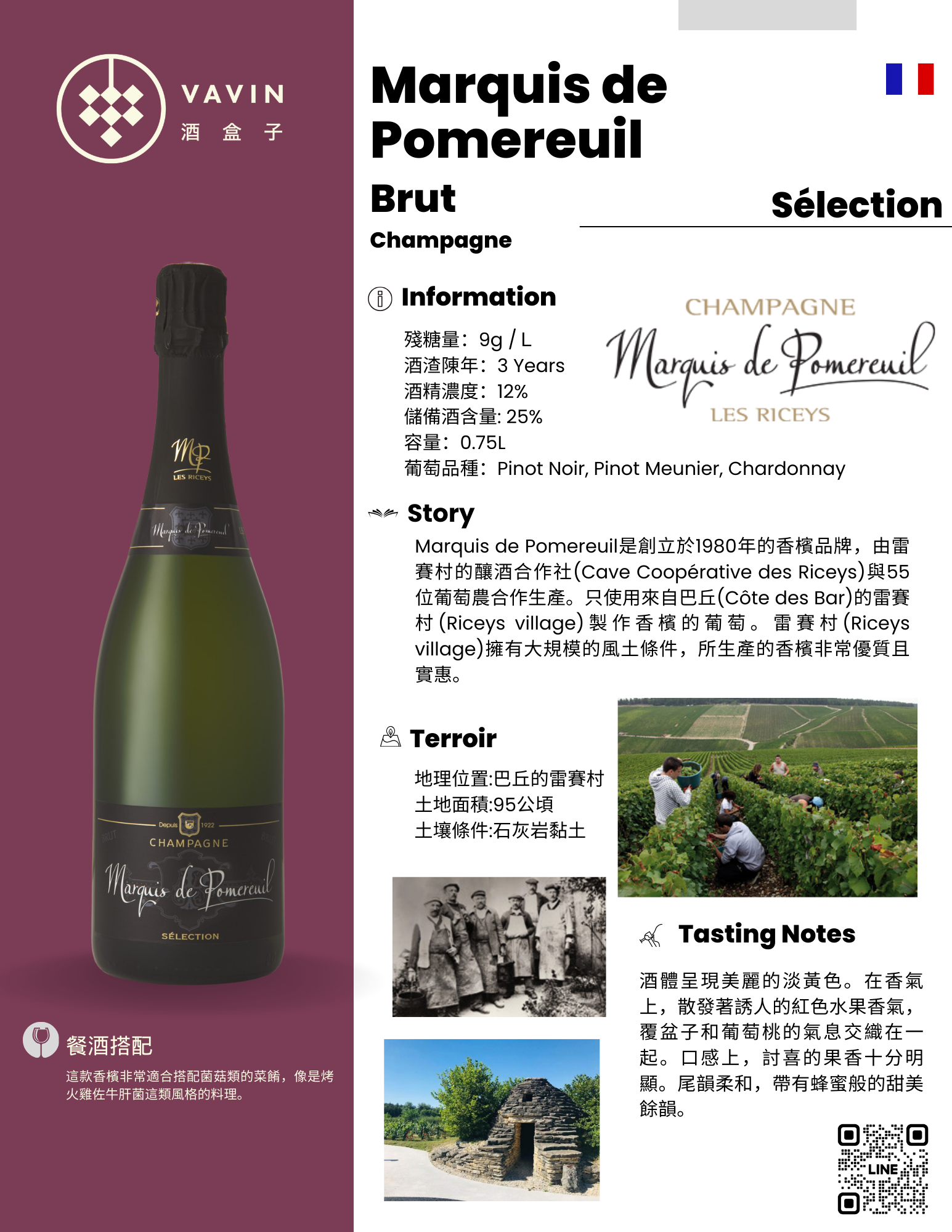 Marquis de Pomereuil是創立於1980年的香檳品牌,由雷賽村的釀酒合作社(Cave Coopérative des Riceys)與55位葡萄農合作生產。只使用來自巴丘(Côte des Bar)的雷賽村(Riceys village)製作香檳的葡萄。