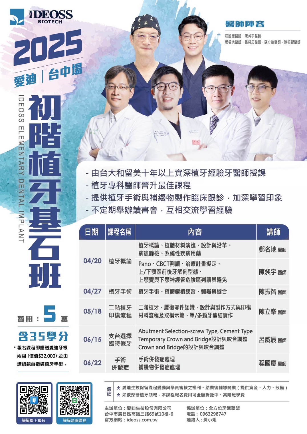 *報名課程即贈送愛迪人工牙根兩組並由講師親自指導植牙手術(價值$32,000)