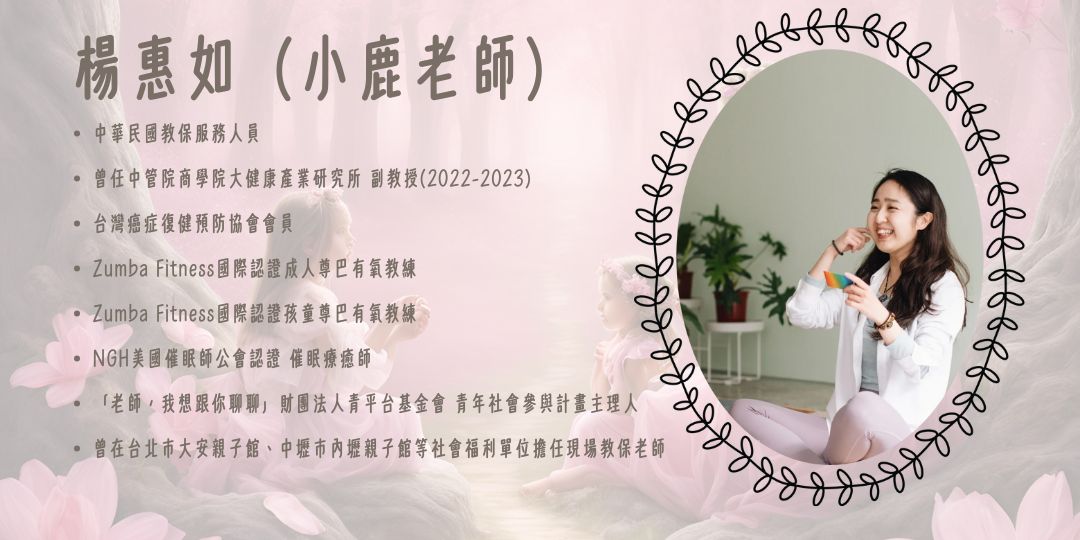 曾在台北市大安親子館、中壢市內壢親子館等社會福利單位擔任現場教保老師,提供現場育兒教養諮詢服務。擔任桃園市政府青年局合作職人講師,與華視訓練中心、台灣任意存公司、零壹科技、瑞傳科技、台北東方工商、人本教育文教基金、Cancell 醫抗癌等單位授課合作提供有氧舞蹈運動、身心放鬆等課程活動。