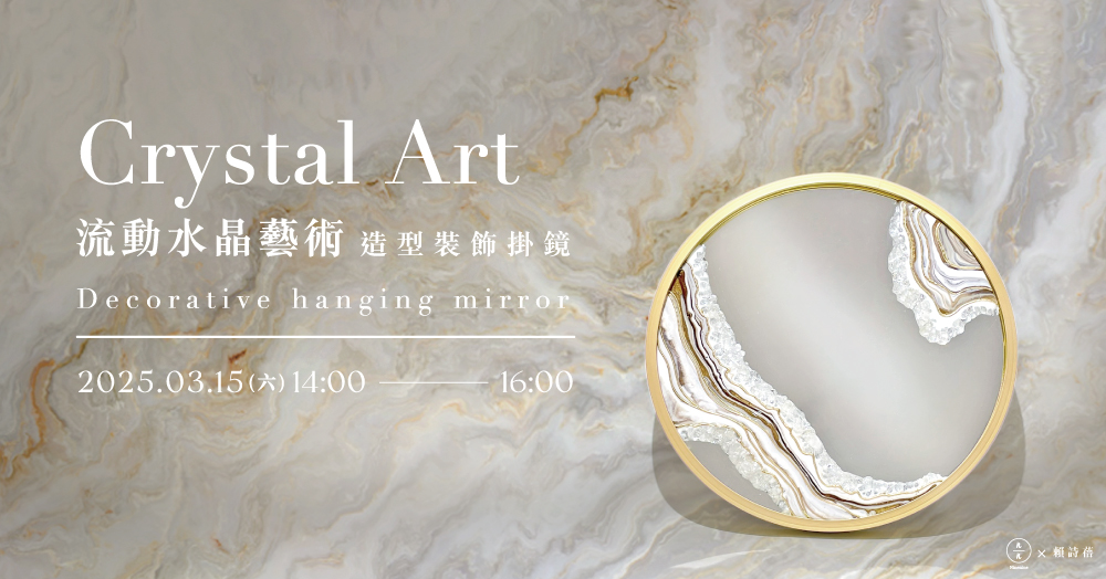 水晶能帶來幸福的正能量,依照顏色有不同的功效,白水晶淨化身心、紫水晶帶來好人緣、粉水晶提升魅力…等。而水晶不僅能做成飾品與布置擺設,更能運用在藝術創作上。晶瑩的水晶搭配剔透的樹脂,流動畫加上水晶加持,讓手作更升級,獨特又療癒,給你滿滿正能量,創作出不同凡響的藝術氛圍。