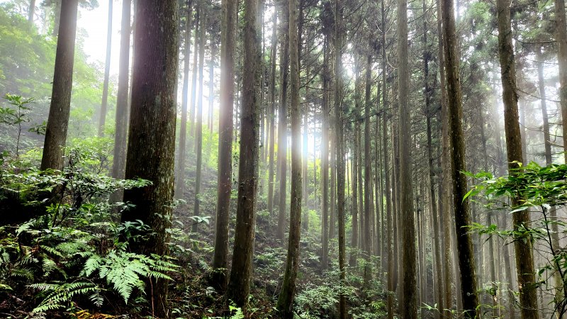 山頂雖然沒有展望,但是步道沿途卻相當迷人。步道開闊處可以看見矗立在眼前的五指山,天氣好的時候,還能夠看到南庄。走入森林之中,光影點點搖曳、草木努力地往上伸展,筆直的柳杉,讓人忍不住想伸手觸摸一番。