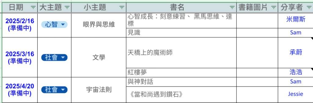 我們是「主題讀書會」,定期由書友們分享不同的主題