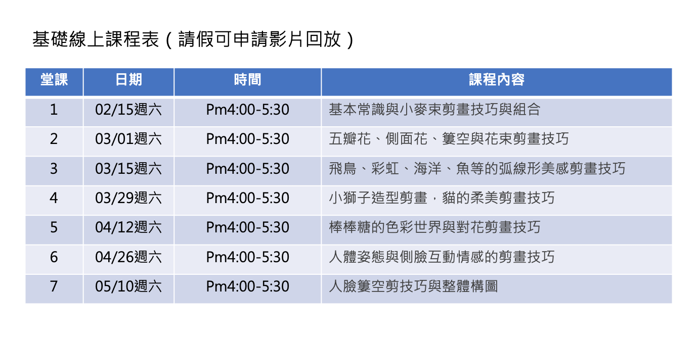 按表上課時間每一堂課為1.5小時,請假同學於課堂結束後申請影片回放。