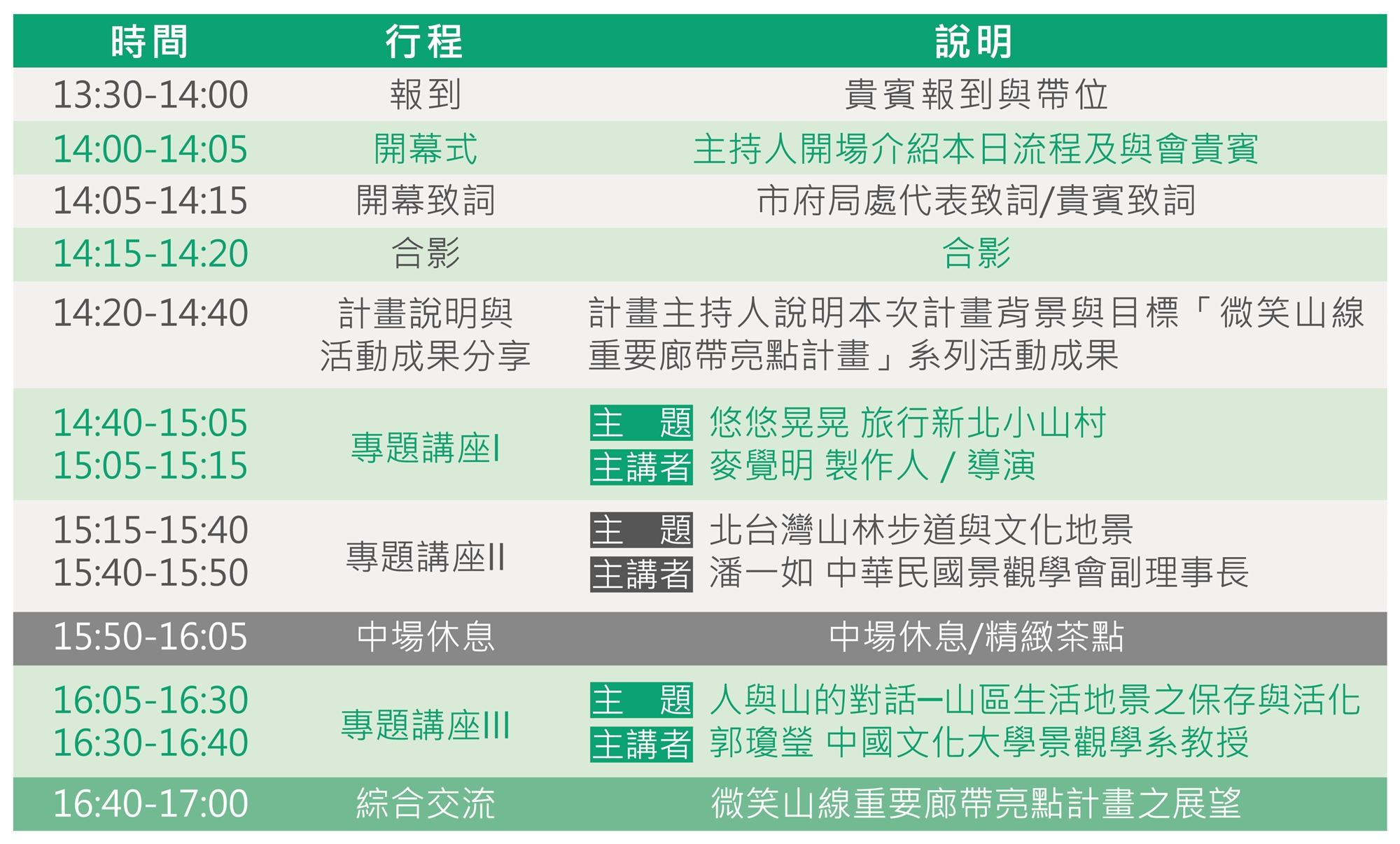 本次成果發表會邀請麥覺明 製作人/導演、郭瓊瑩 教授、潘一如 副理事長,透過深度講座分享與交流,探討微笑山線在低碳永續生態旅遊發展中的可能性,呈現新北家山與聚落的在地性與異質性,並共同思索未來的文化與環境發展藍圖。