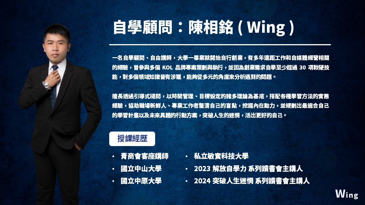一位長期鑽研如何學習的人,同時也是一位自學顧問、講師、創業者,從大學開始經營個人品牌,透過自學多項軟硬技能,20 歲出頭就成為一位自由工作者,開創了一條不同的人生道路。