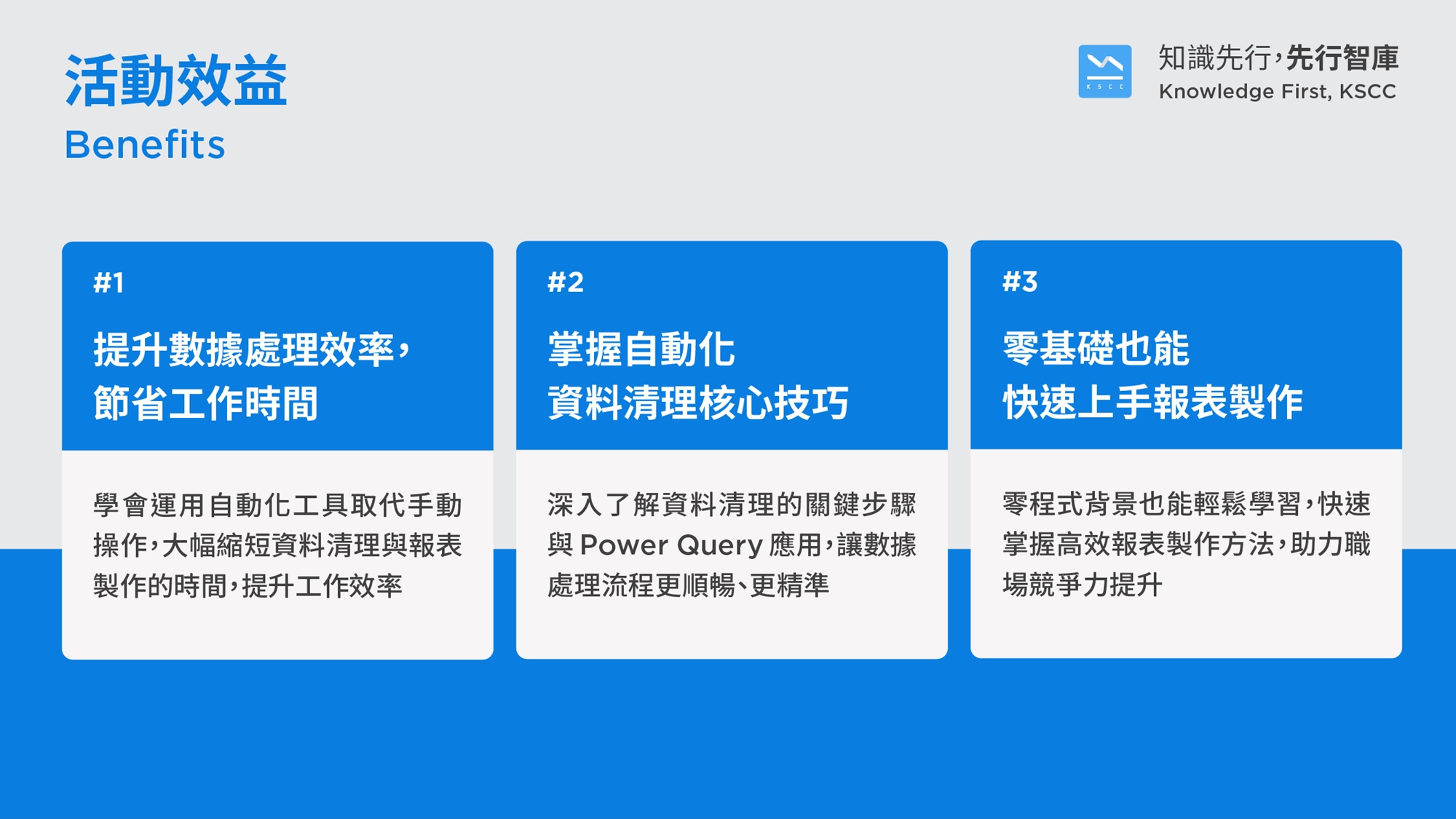 你是否每天被大量的數據困擾,手動整理又耗時又容易出錯?本次研討會將帶你認識 Excel 內建的 Power Query 功能,打造全自動化的資料清理與報表工作流。讓你了解如何一鍵完成資料清理、轉換及整合,從而省去大量重複性操作,提升日常工作效率。無論你是數據處理的新手,還是尋求更快速解決方案的 Excel 進階用戶,這場研討會都將為你提供實用技巧,幫助你在數據整理的挑戰中脫穎而出,在報表製作上事半功倍!
