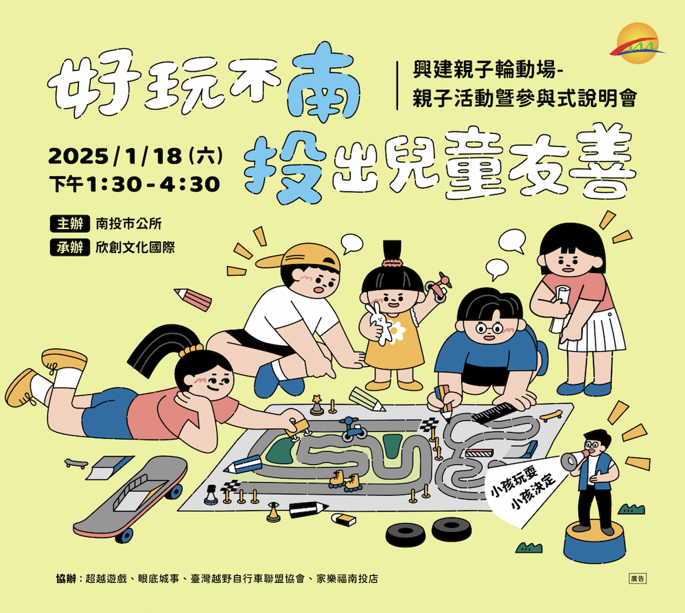 參加 01/18 (六) 下午 13:30~16:30 的 「好玩不南 投出兒童友善」興建親子輪動場說明會和親子活動,大人可以見證「請小孩來決定,可以怎麼玩才是最好玩」,至於小孩呢?就是大玩特玩自由遊戲和輪動遊戲同時,還能選出最想要的親子輪動場~