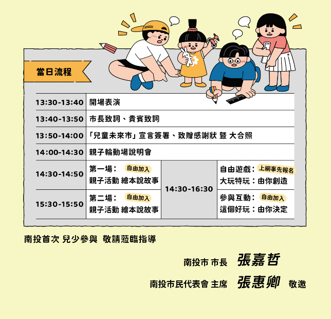 *「好玩不南 投出兒童友善」現場提供皆為免費活動。但因場地限制,自由遊戲每組以 1 大 1 小、1 大 2 小或 2 大 2 小計算,容納人數僅止於 60 組上下,請預先報名登記。如果孩子和您報名後,不克出席,也請先來信或來訊通知主辦單位,將空位釋出給其它想預先報名的朋友。