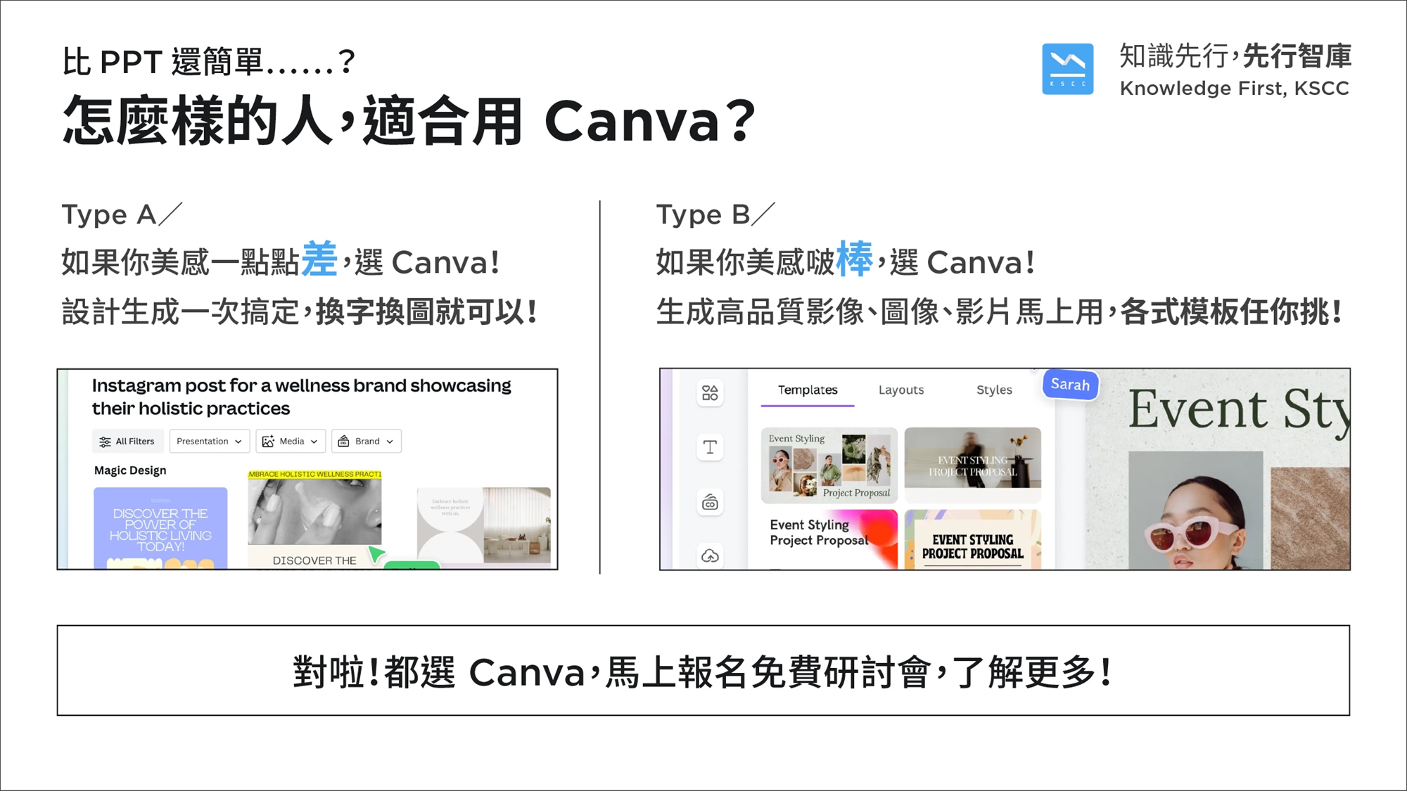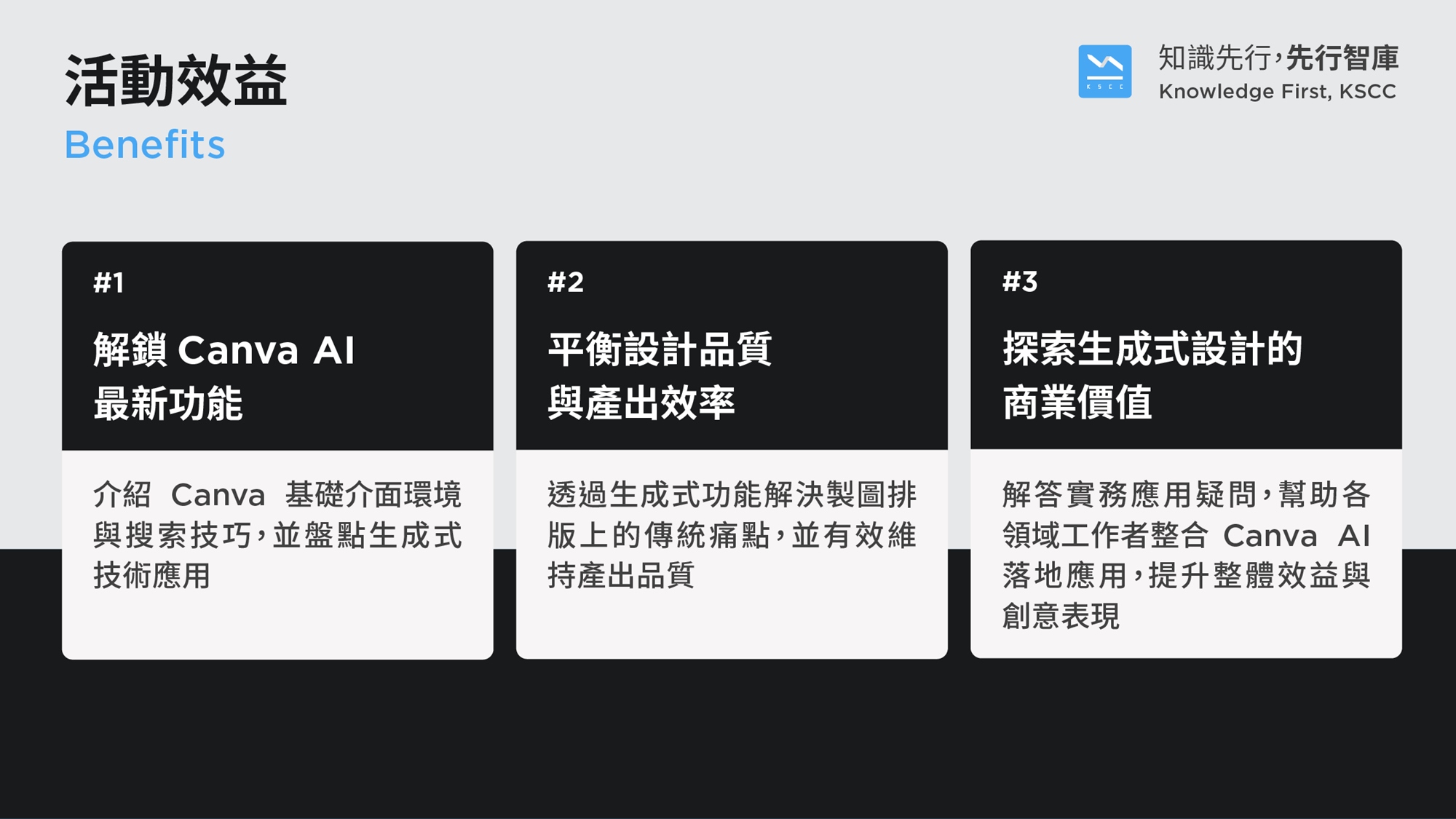 生成式設計正全面改變品牌行銷與數位內容的創作方式,而 Canva AI 以其領先技術與易用性成為眾多產業首選工具。本次研討會將收斂 Canva 的5大特色,讓零經驗或基礎使用者快速了解其軟體應用,並示範數個 Canva AI 功能實際效果與適合情境。展現生成式工具如何讓行銷、社群經營、業務與品牌管理者快速產出高品質設計,且傳遞有效資訊。