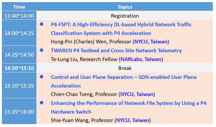 本活動邀請國立陽明交通大學電機系-温宏斌教授、資工系-曾建超教授與王協源教授、以及國家實驗室-劉德隆博士,分享最新的台灣P4/可程式化網路技術之學術研究成果,我們誠摯地邀請大家一同參與盛會。