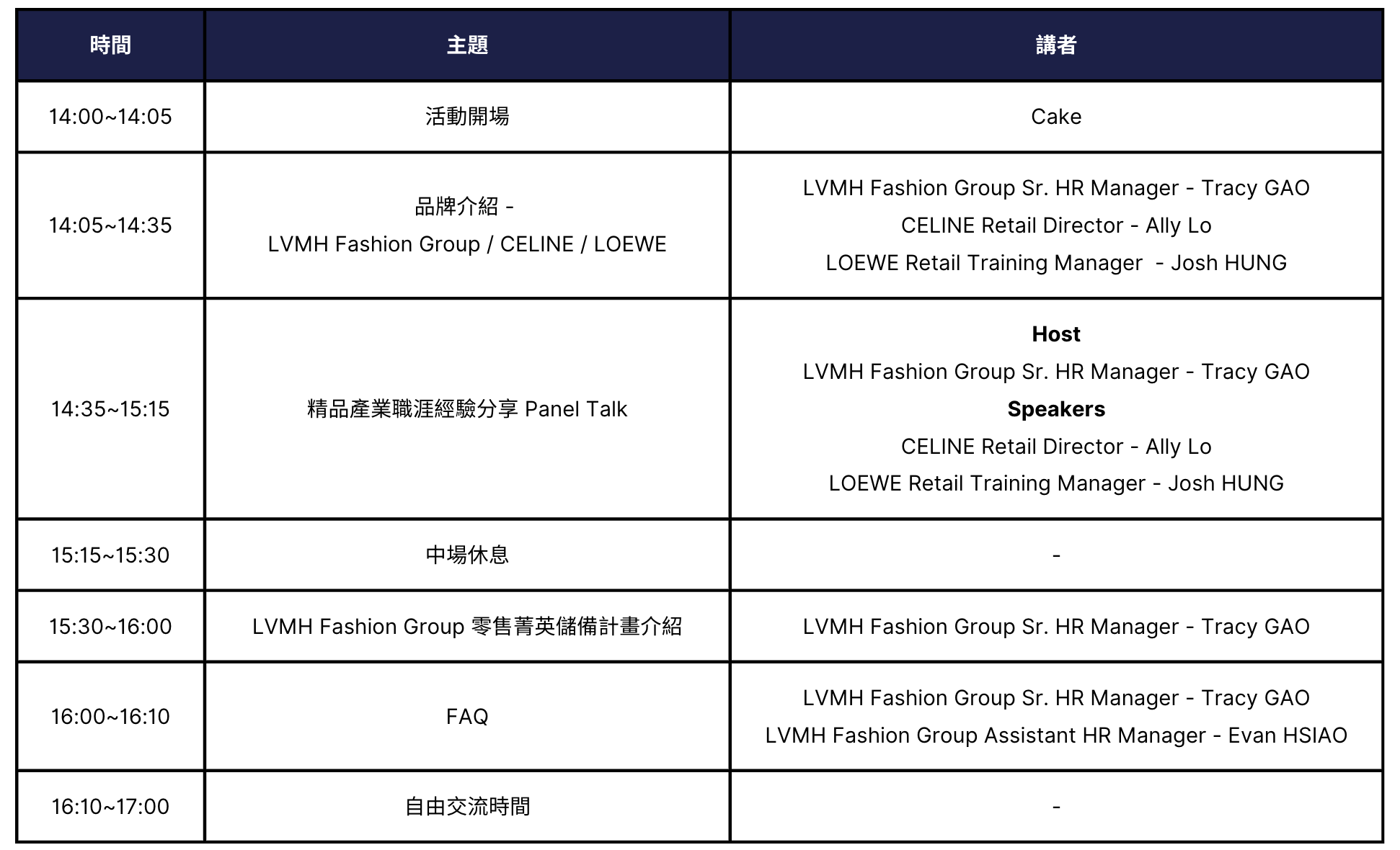 LVMH Fashion Group 作為全球時尚奢華產業的領導品牌,一直致力於推動創新與卓越。旗下擁有眾多知名品牌,台灣直營品牌為 CELINE、LOEWE,並以提供優質產品與服務聞名全球。本次活動將聚焦於零售菁英儲備計畫,這是一個專為培育精品零售菁英而設計的培訓計畫,協助年輕人才發掘潛力,實現職業目標。