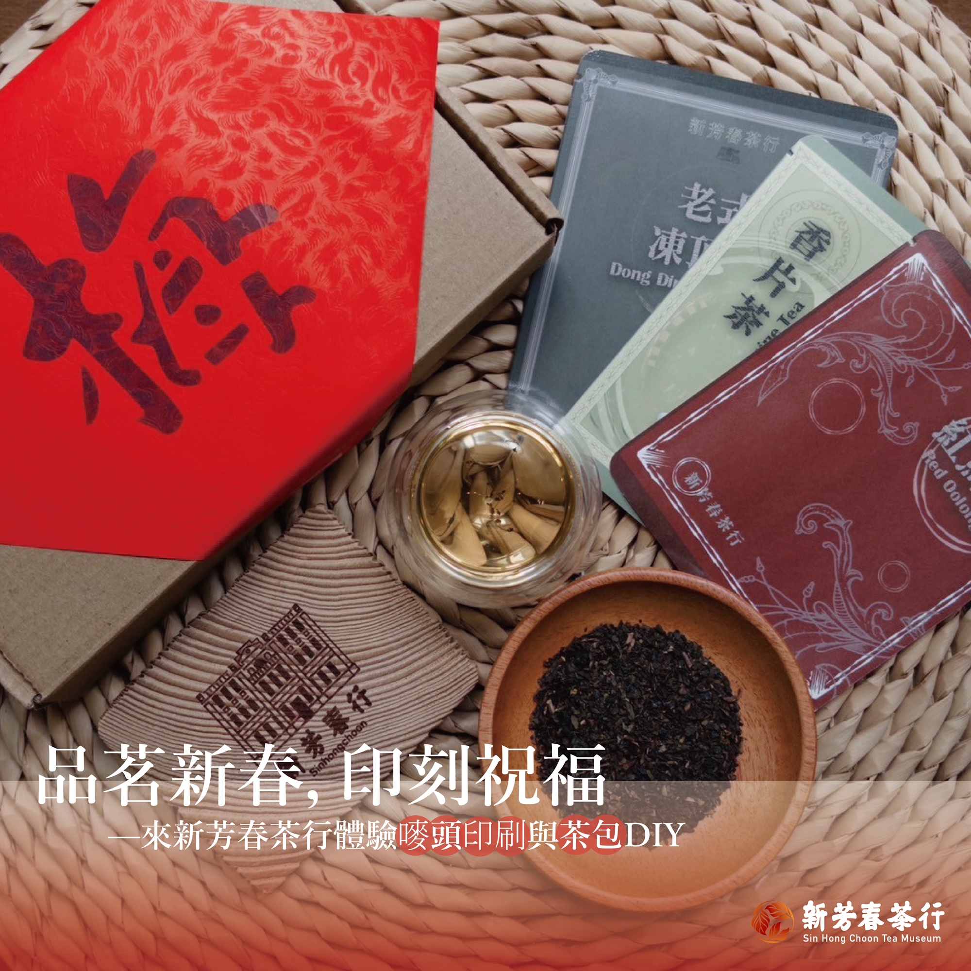 體驗茶箱嘜頭印刷專屬自己的新春春聯迎新年,並搭配親自手作茶包DIY體驗,作品皆可以帶回家自己留存,也可以送禮與親朋好友分享美好茶香回憶。