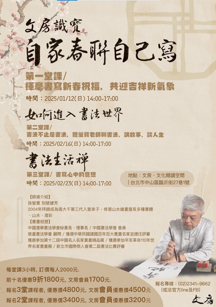 單堂課程:每堂2000元,首10名早鳥價1800元(文房會員1700元)