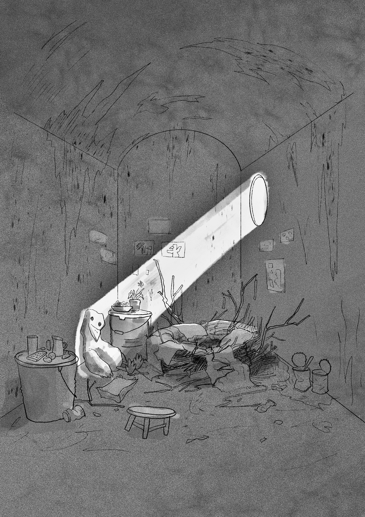 一隻人模人樣的暗光鳥,在草叢中出沒,四處行走,拾起散落的日常物品——生鏽的金屬器具、一片斷裂的玻璃。它將這些物品一一放入隨身的袋子中,暗光鳥在光影中現身,時而清晰,時而模糊,準備帶領大家向未知前行。