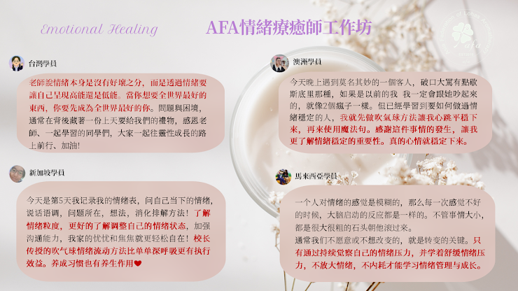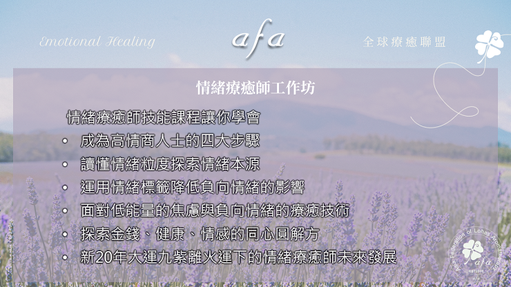 🍀 AFA國際認證學院成立於2010年,是亞洲第一家以情緒療癒為出發點的國際認證機構,AFA同時擁有國際芳療師、心靈療癒師、催眠師授權的國際學校,AFA也致力於幸福企業的推廣,AFA目前在台灣、大陸、新加坡、馬來西亞、加拿大、美國、澳洲...等地方都有教育發展,邀請大家一起成為自己與家庭的療癒師。