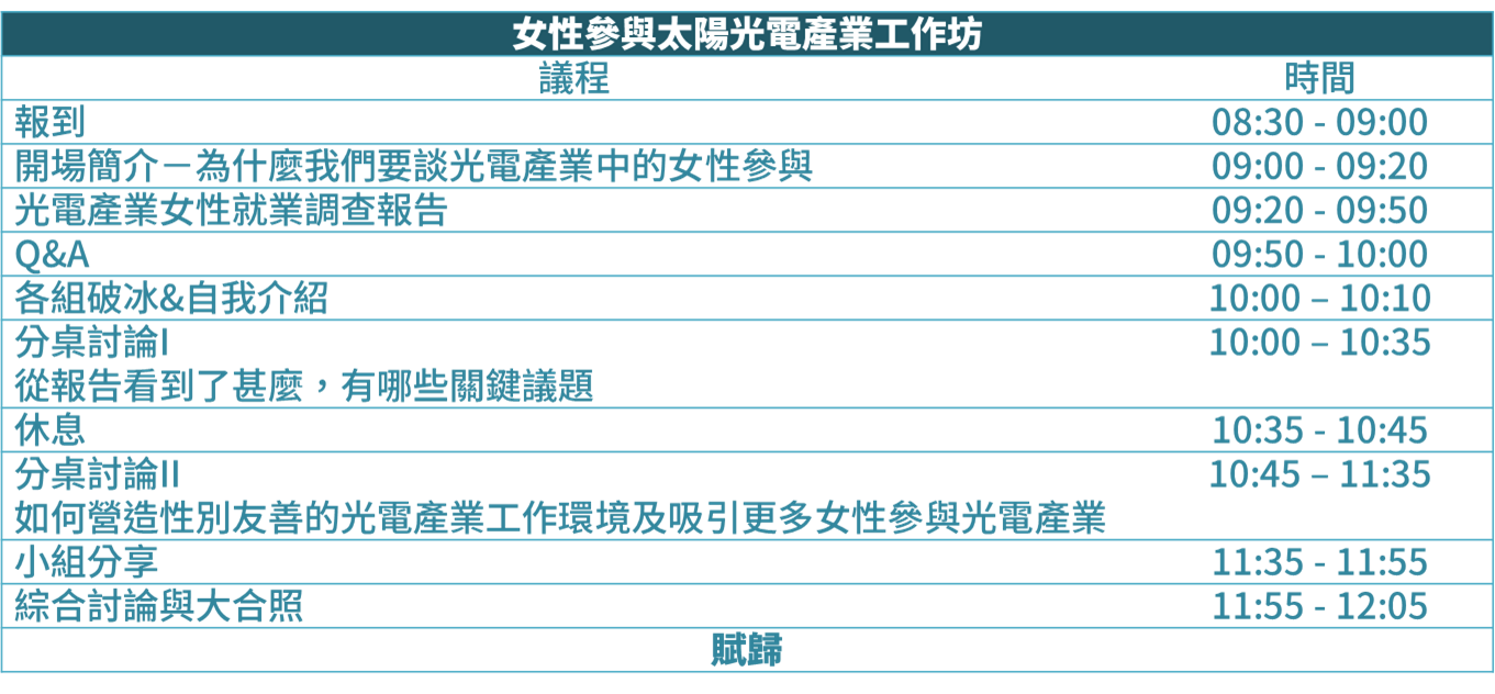 因應女性與脆弱族群既存的社會不公平的困境,台灣尼阿斯與台灣綠能公益發展協會共同跟國家發展委員會提案,在本年度展開一系列針對女性及脆弱族群的公正轉型行動。其中,本計畫透過訪談以及問卷調查,了解在光電產業中女性的角色與想像,並透過辦理本工作坊,對外揭露階段性研究成果,期能強化女性在淨零轉型過程中的參與和對話。
