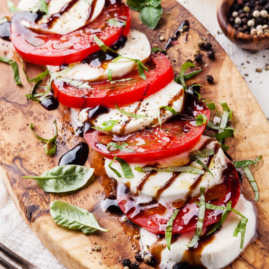 4.卡布里沙拉(caprese salad)︰番茄、羅勒葉、新鮮莫札瑞拉起司、巴薩米克醋。