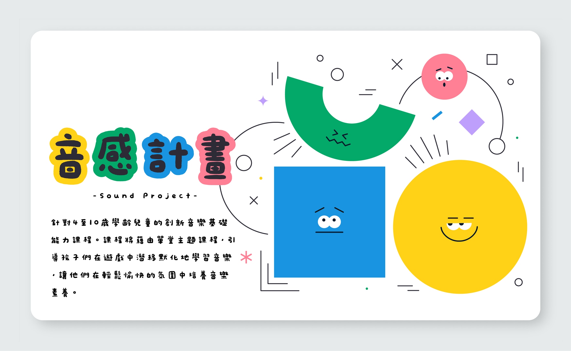 - 透過有趣的活動與活動,幫助孩子們逐步認識音樂的基本元素,建立音樂基礎。
