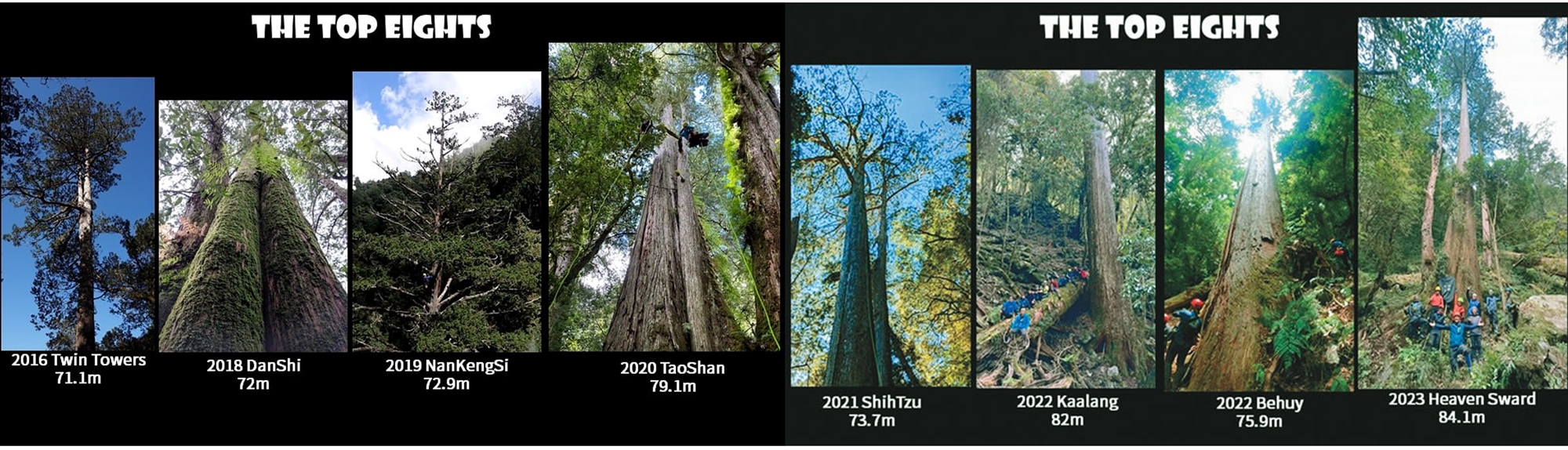 2023年春節寒流期間,徐嘉君博士率領「找樹的人」團隊花費七天時間,橫渡冰冷又強勁的溪水、行經岳界著名的「東邪西毒」險峻山嶺深入大安溪溪谷,找到光達資料「#55214」臺灣杉巨木,實際攀爬至樹冠層測量後確認樹高84.1公尺,以「倚天一出、誰與爭鋒」之意,取名為「大安溪倚天劍」,為東亞最高巨木。