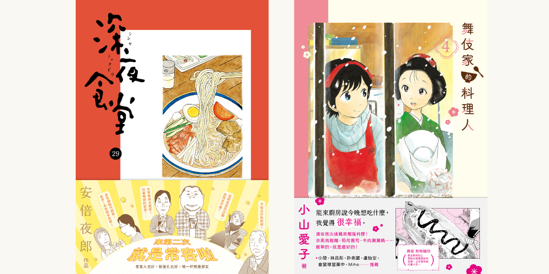 安倍夜郎的作品《深夜食堂》以都會區巷弄裡從深夜開始營業的食堂為舞台,將老闆做出的平民料理,與形形色色的客人的故事融合,洋溢最質樸的人情味。小山愛子的《舞伎家的料理人》,則將少女們群居於神秘花街的真實面貌,以輕鬆詼諧又溫暖的筆法描述友情與親情,讓人產生會心一笑的療癒感。