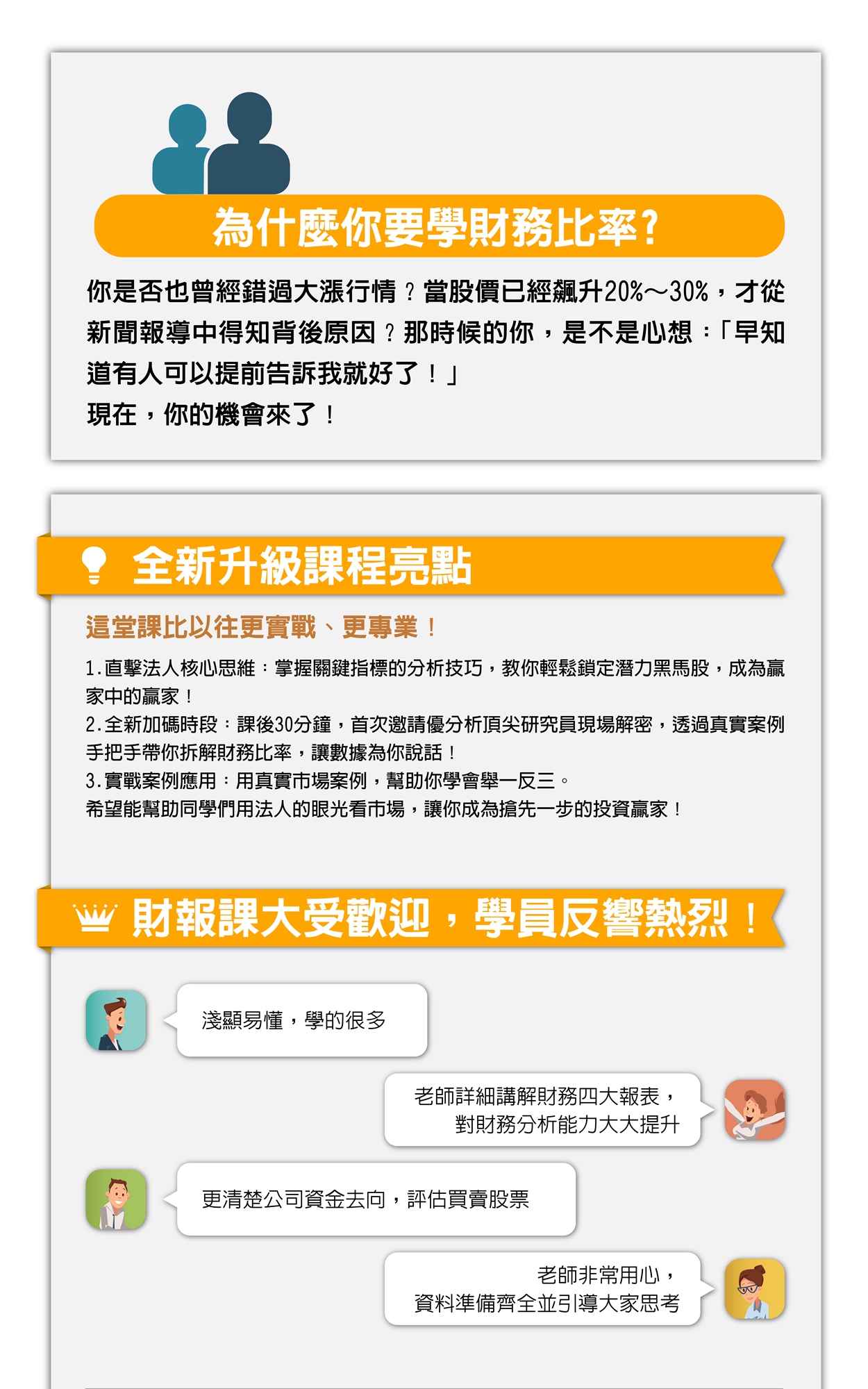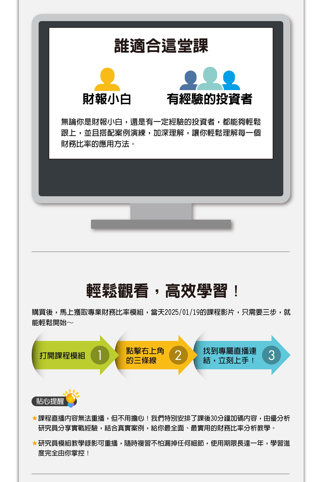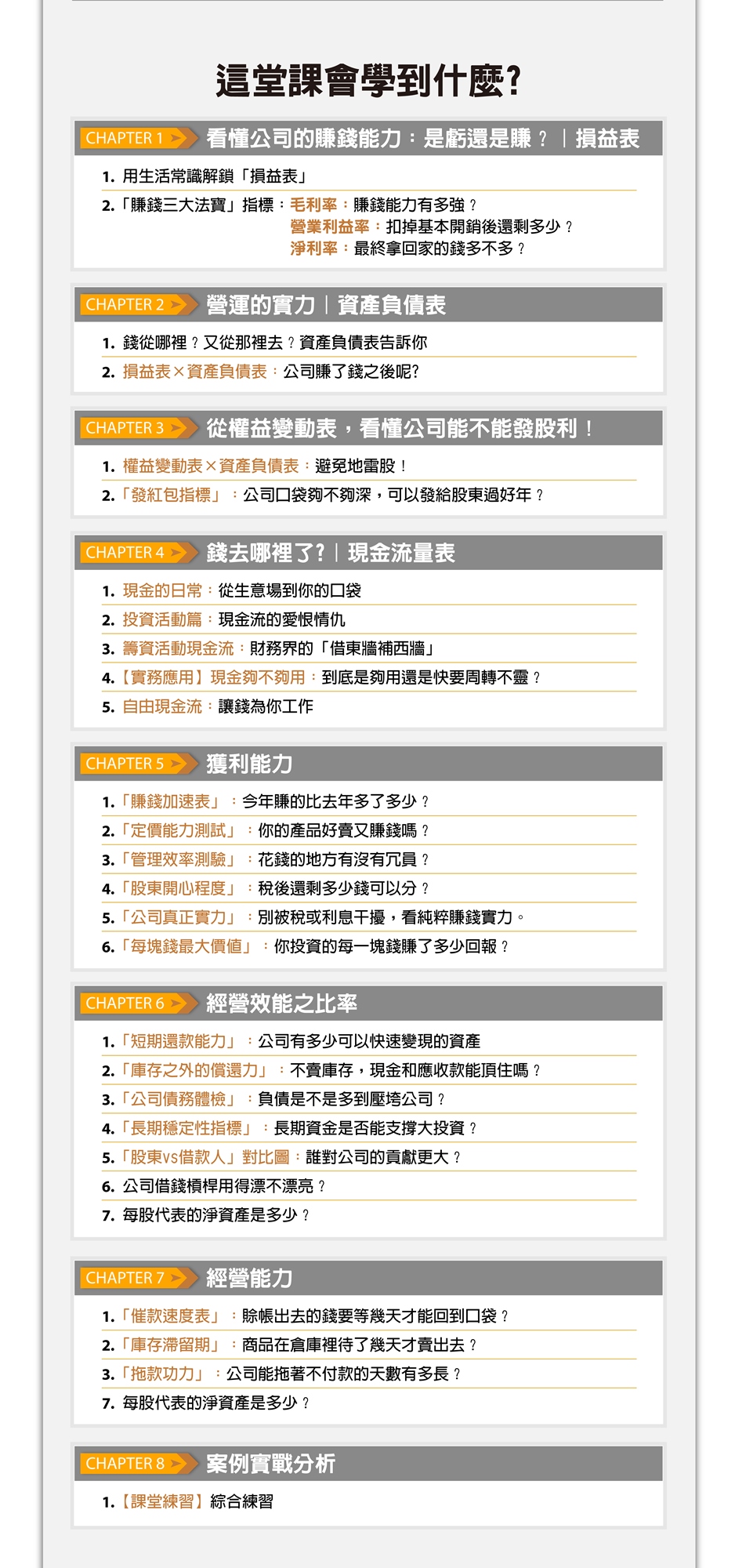 我們還會提供您實用的『財報數據模組』,幫助您了解國內外財報分析的實戰技巧,並判斷出一間公司營運潛能!