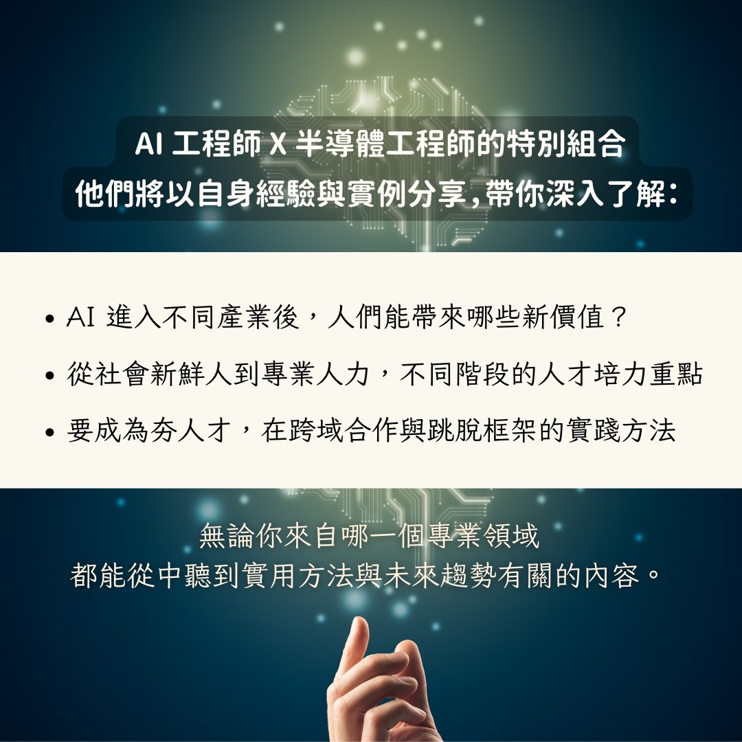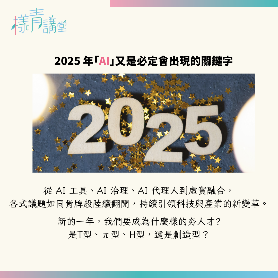 從 AI 工具、AI 治理、AI 代理人到虛實融合,各式議題如同骨牌般陸續翻開,持續引領科技與產業的新變革。在新的一年,新的一年,我們要成為什麼樣的夯人才?是T型、π型、H型,還是創造型?本次「樣青講堂」特別邀請到兩位實力派講員,一位是 AI 工程師,另一位是 半導體工程師,他們將以自身經驗與實例分享。讓你的 2025 年持續加分、成為企業搶手的好人才!
