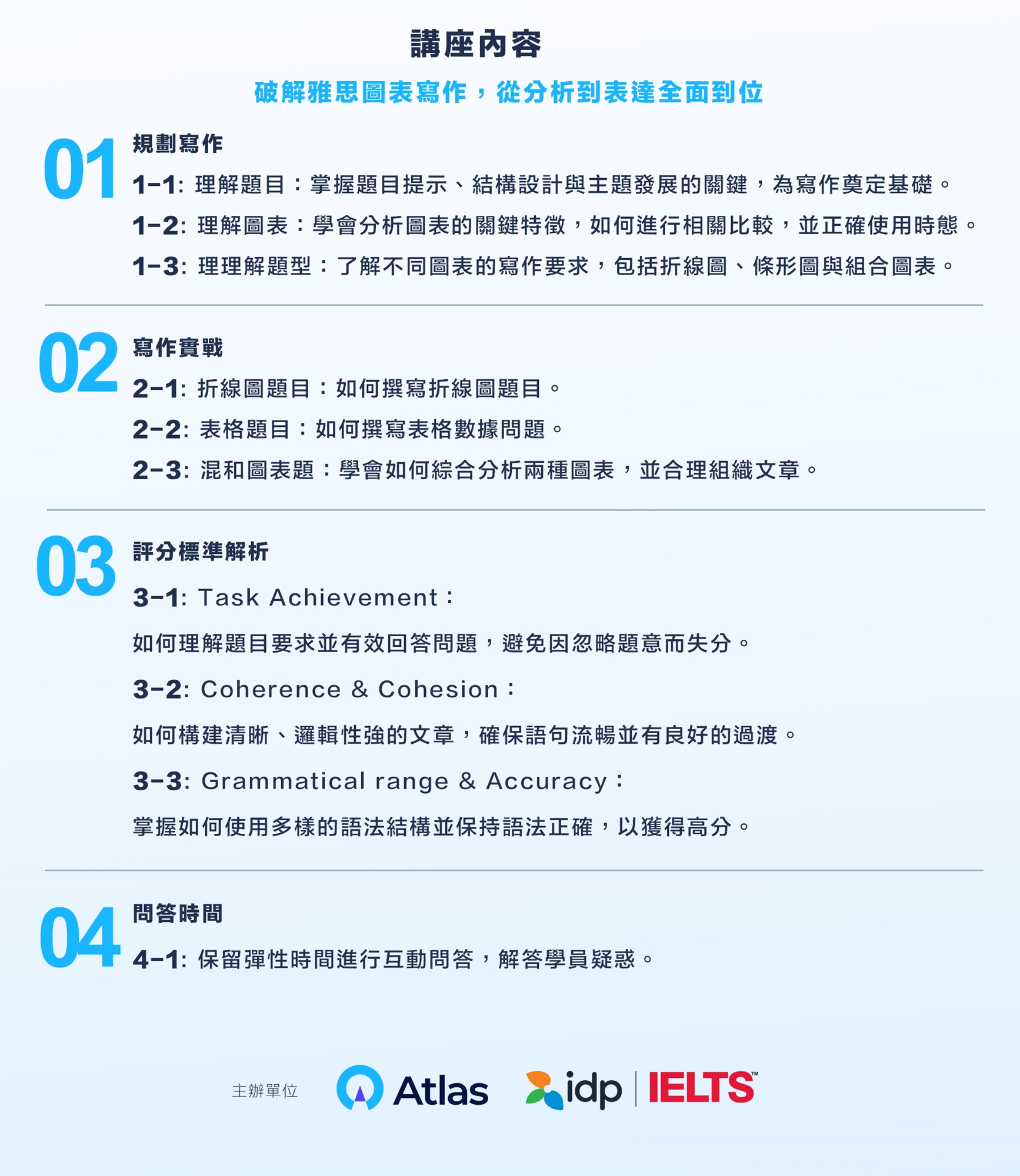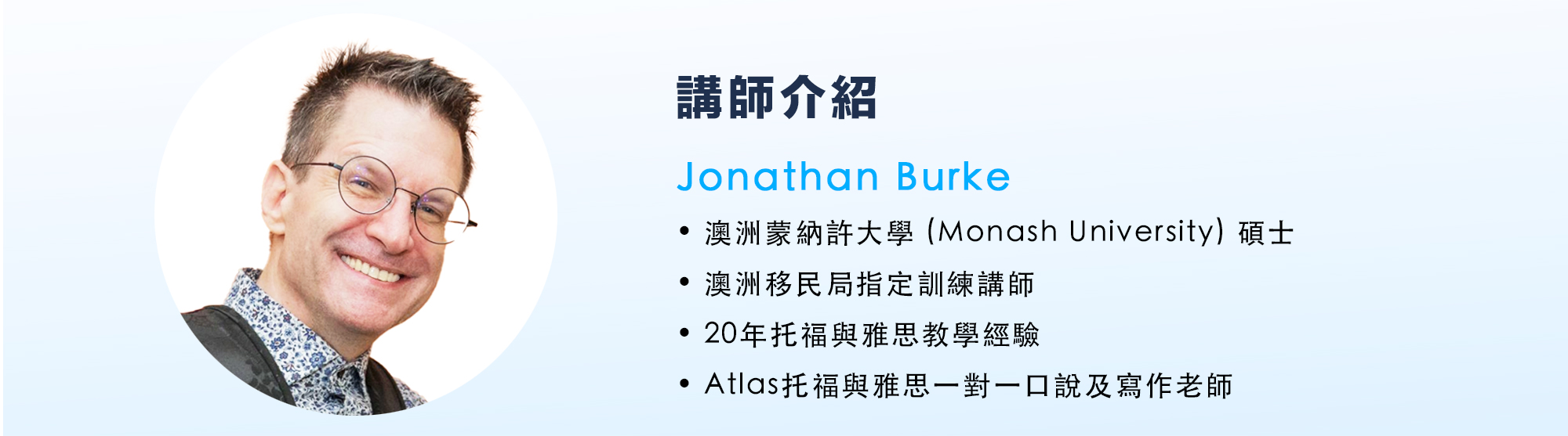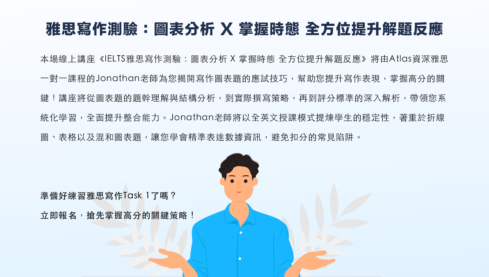 本場線上講座《IELTS雅思寫作測驗:圖表分析 X 掌握時態 全方位提升解題反應》將由Atlas資深雅思一對一課程的Jonathan老師為您揭開寫作圖表題的應試技巧,幫助您提升寫作表現,掌握高分的關鍵!