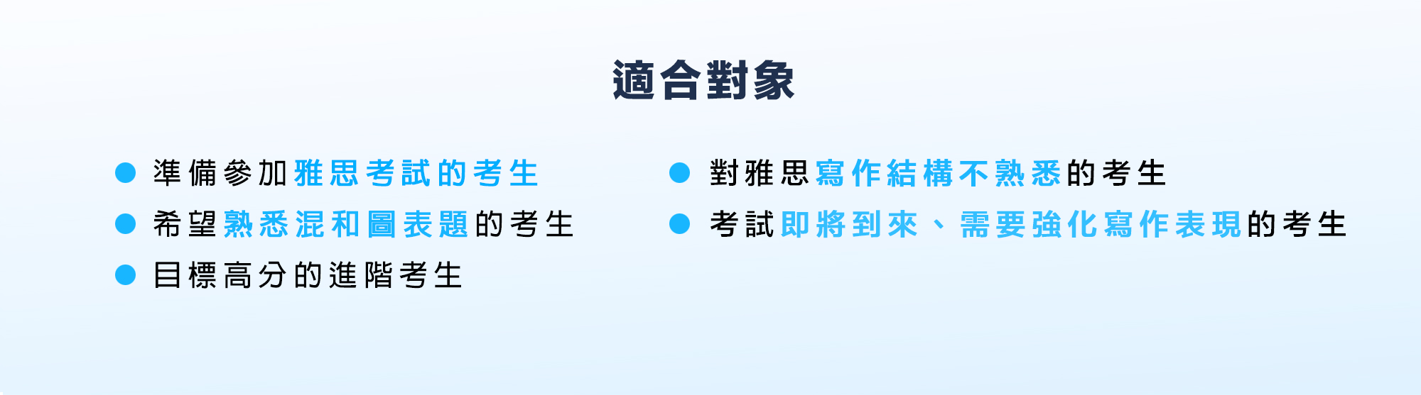 講座將從圖表題的題幹理解與結構分析,到實際撰寫策略,再到評分標準的深入解析,帶領您系統化學習,全面提升整合能力。Jonathan老師將以全英文授課模式提煉學生的穩定性,著重於折線圖、表格以及混和圖表題,讓您學會精準表達數據資訊,避免扣分的常見陷阱。