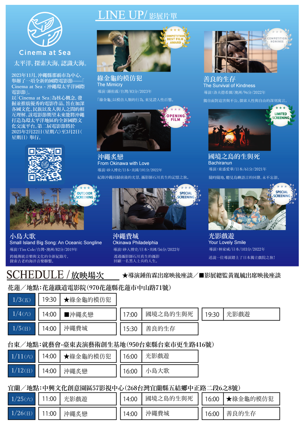 於2023年秋季第一屆正式舉辦在沖縄那覇舉行的這個電影節,將於2024年春季,於結合沖繩的先島諸島(宮古群島、八重山群島)與台灣的東海岸(宜蘭、花蓮、台東)舉行跳島各地巡迴電影展,提供太平洋島嶼與多元民族文化交流的獨特體驗。