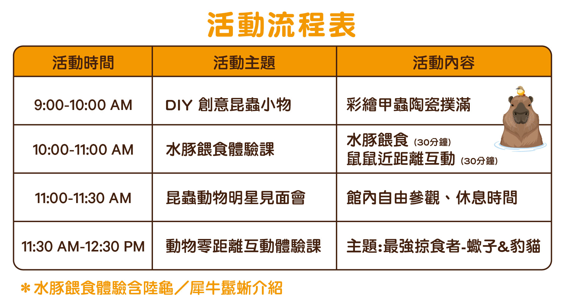 ◌ 活動內容|動物零距離互動體驗課+水豚餵食體驗課+DIY 創意昆蟲小物