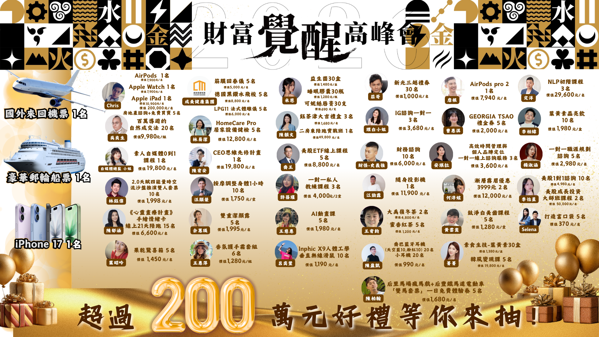 限定抽獎、豐富禮品再升級!2026活動全面加碼,從千元禮品到萬元課程,只有你想不到,沒有我們抽不到!歷年來都讓讓每一位參與者能滿載而歸,不虛此行!2026年特別再抽Iphone17、豪華郵輪之旅、出國旅遊機票,獎項抽到手抽筋,學習還能拿獎金!