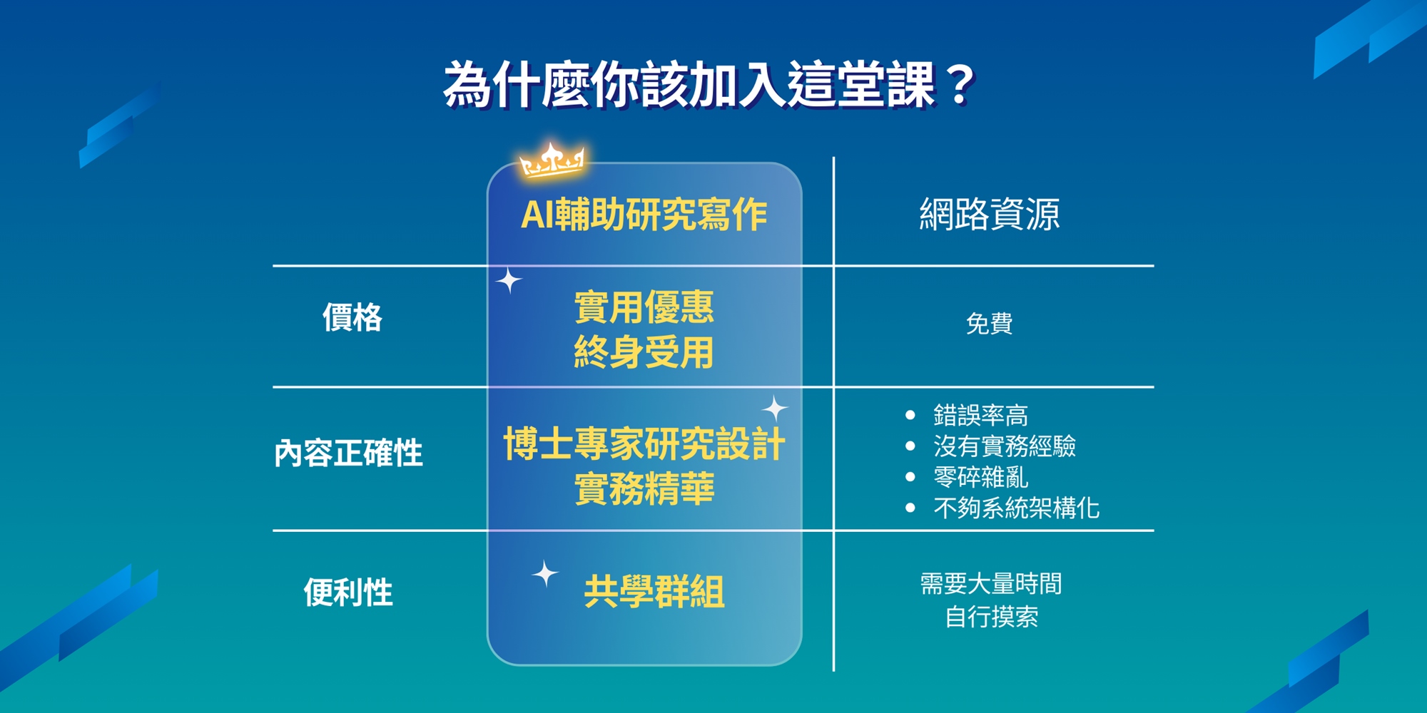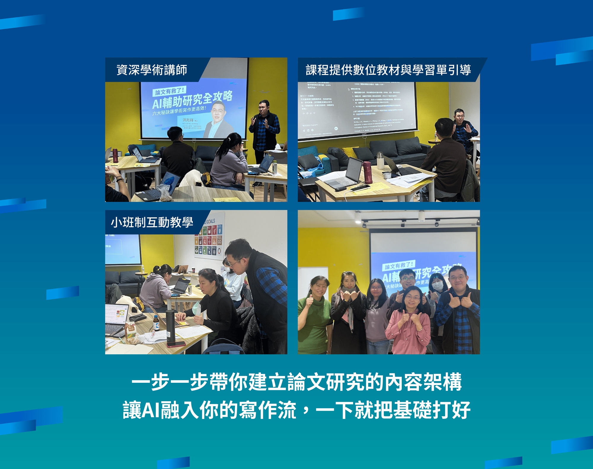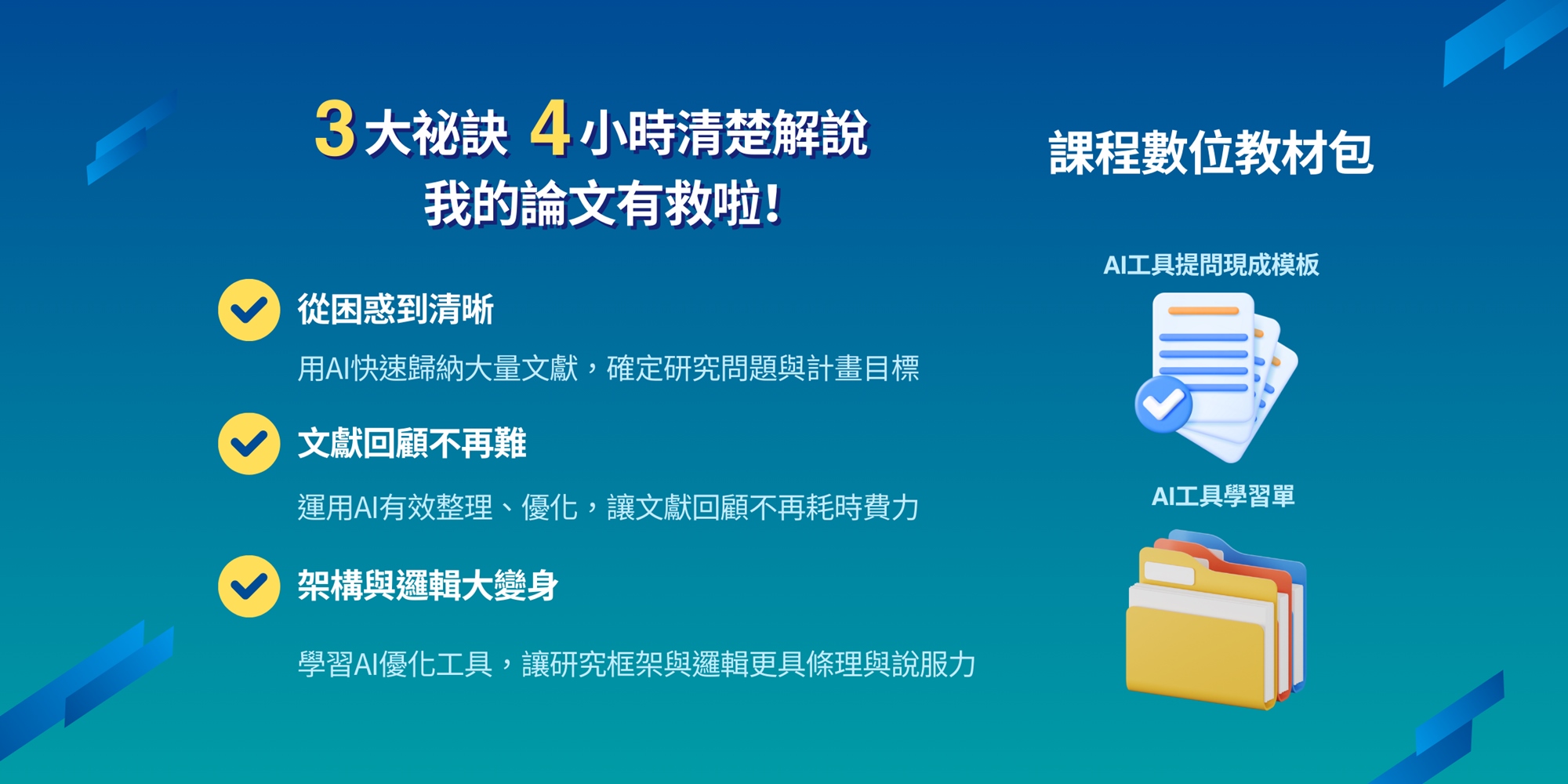 課程更提供即時的數位學習單與實作範例,讓你迅速上手,從複雜的論文中解放出更多時間享受生活!