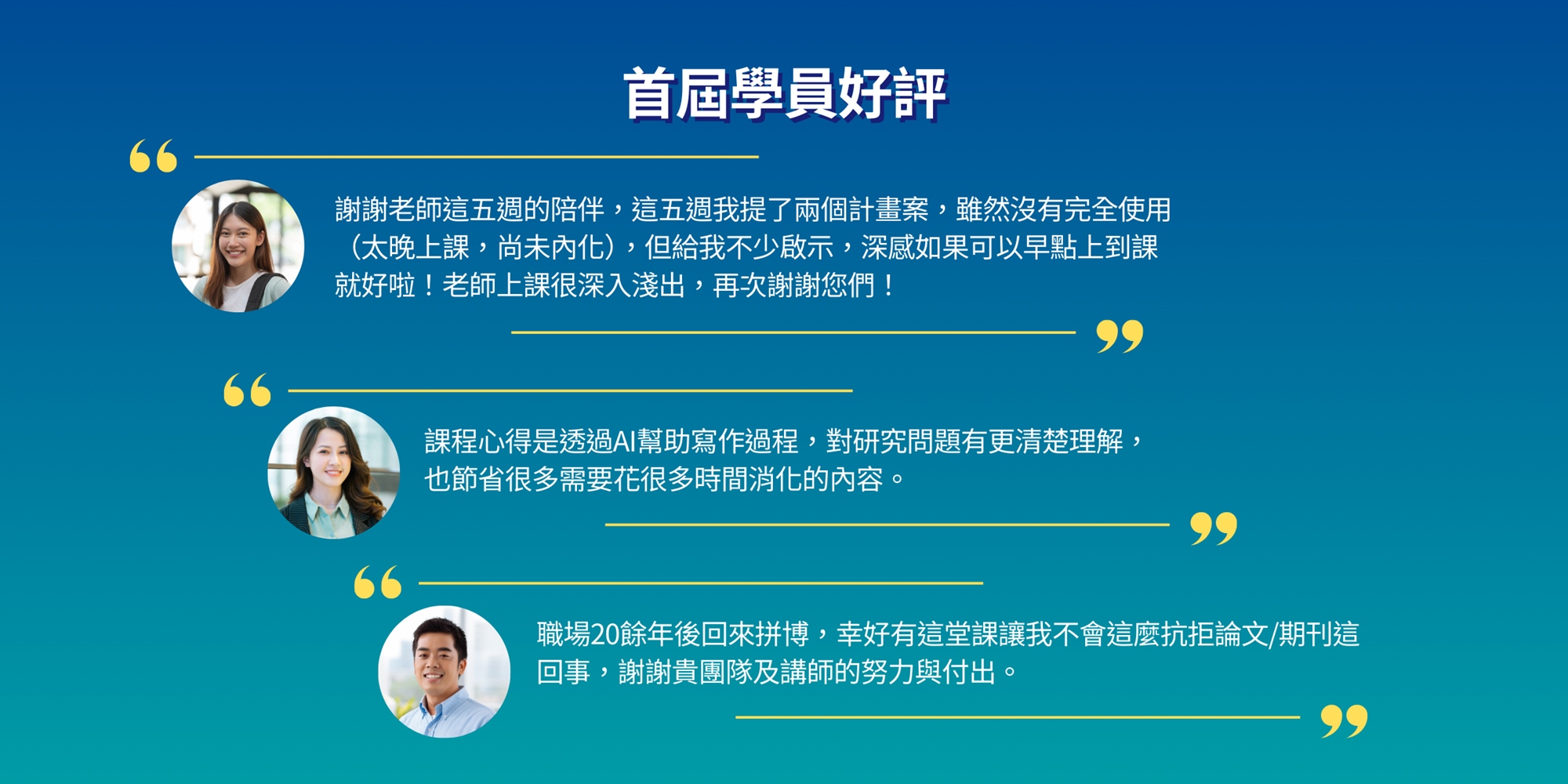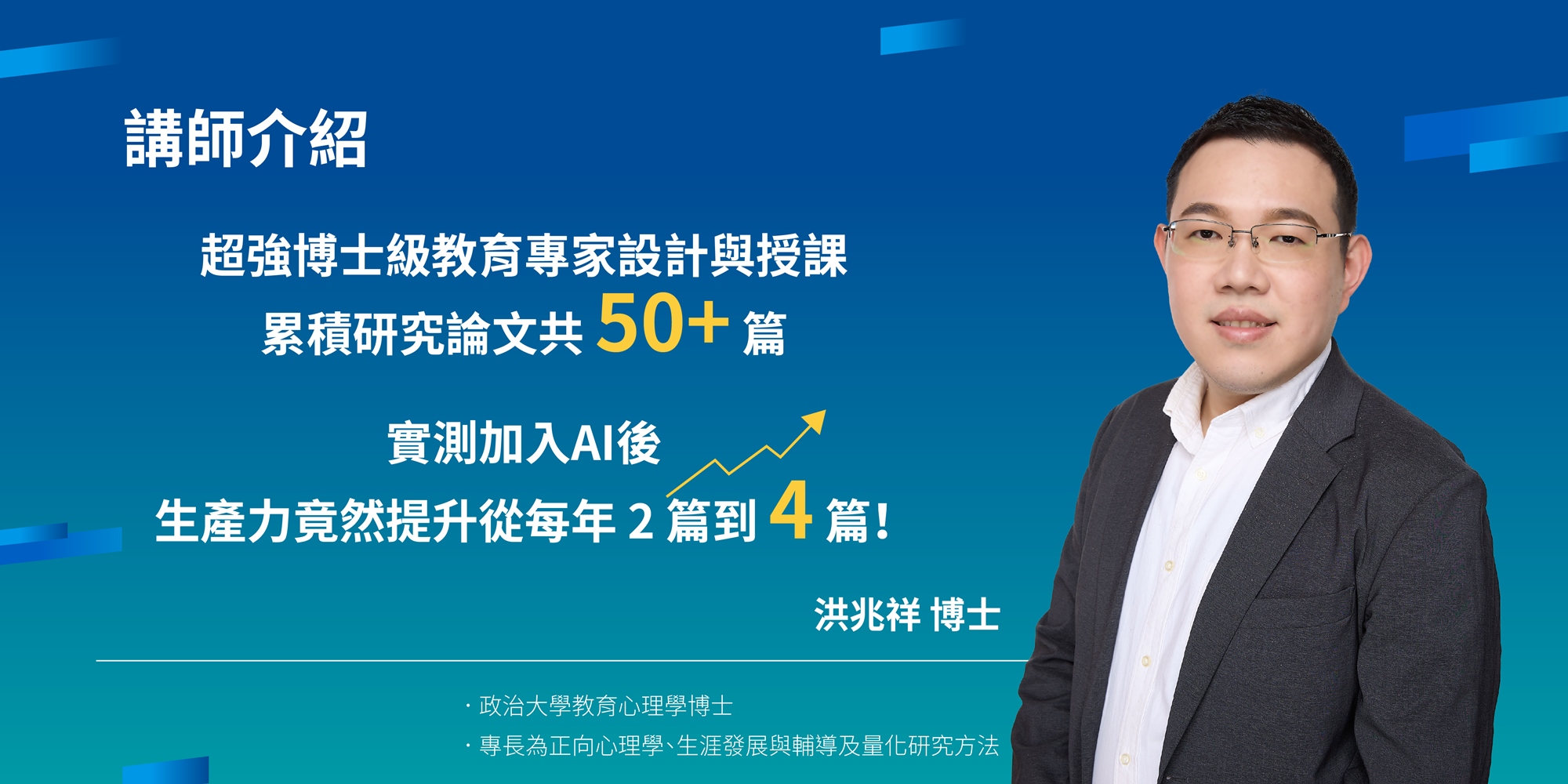 透過「AI輔助研究寫作初階班」,你將學習精準運用Perplexity、NotebookLM、ChatGPT,大幅縮短文獻整理時間,同步優化研究架構與內容。