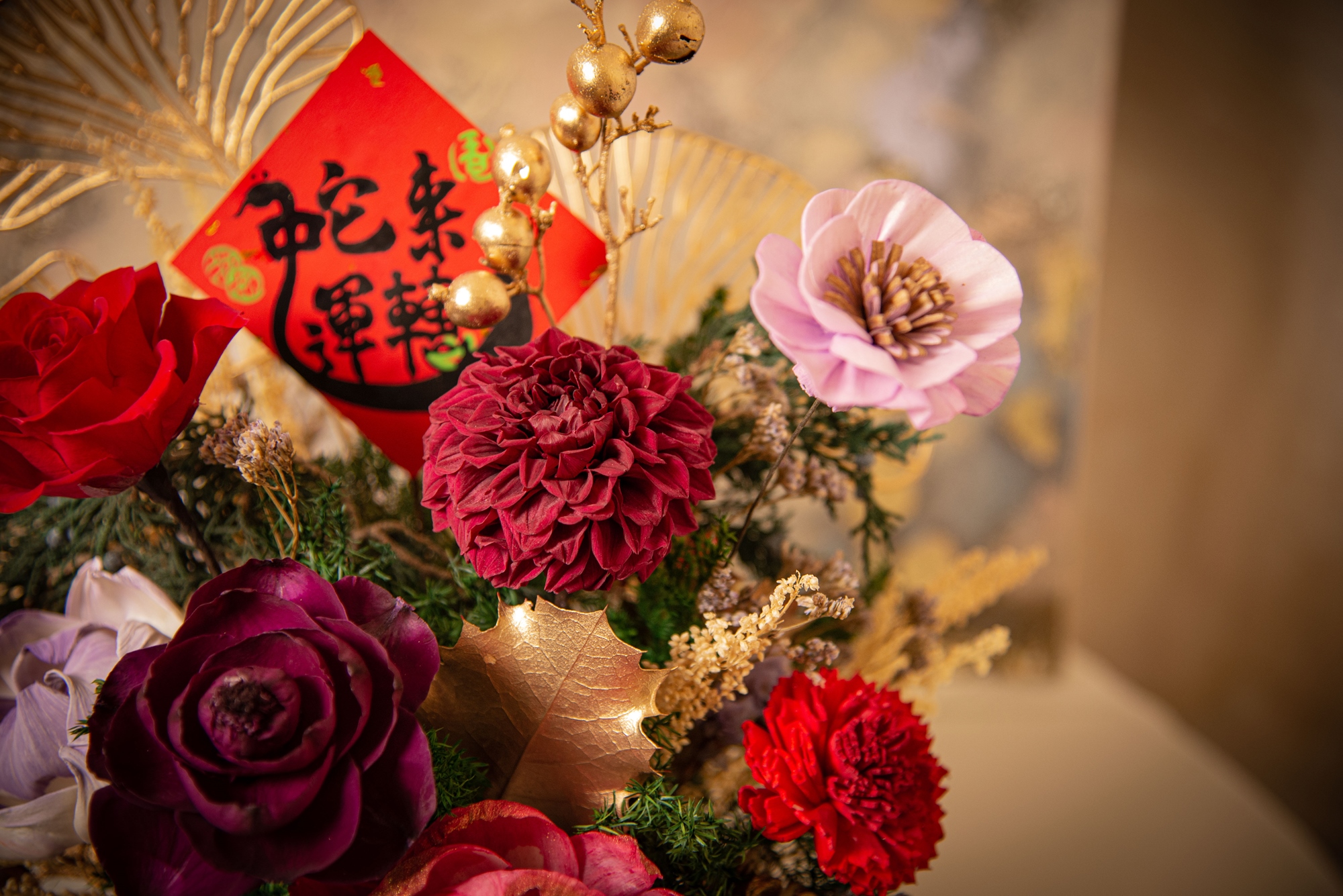 今年花禮主色用紅到發紫的紫紅色設計,
