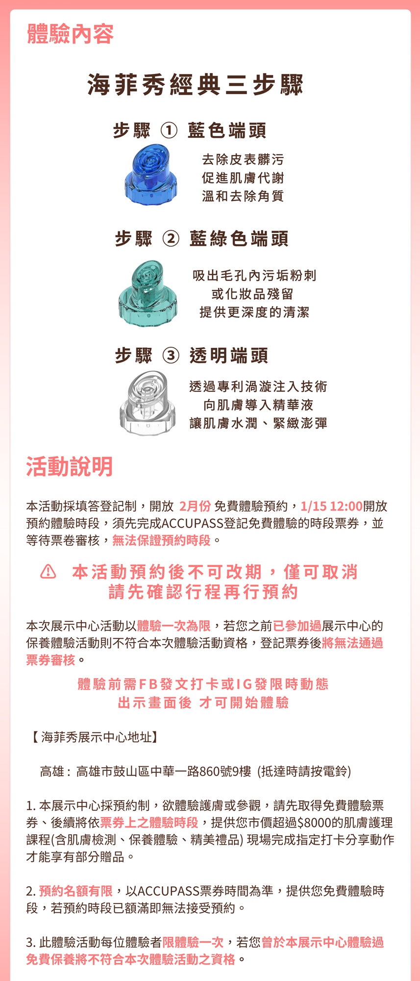 【高雄-海菲秀原廠展示中心】2月份免費體驗 01/15 中午12:00開搶!