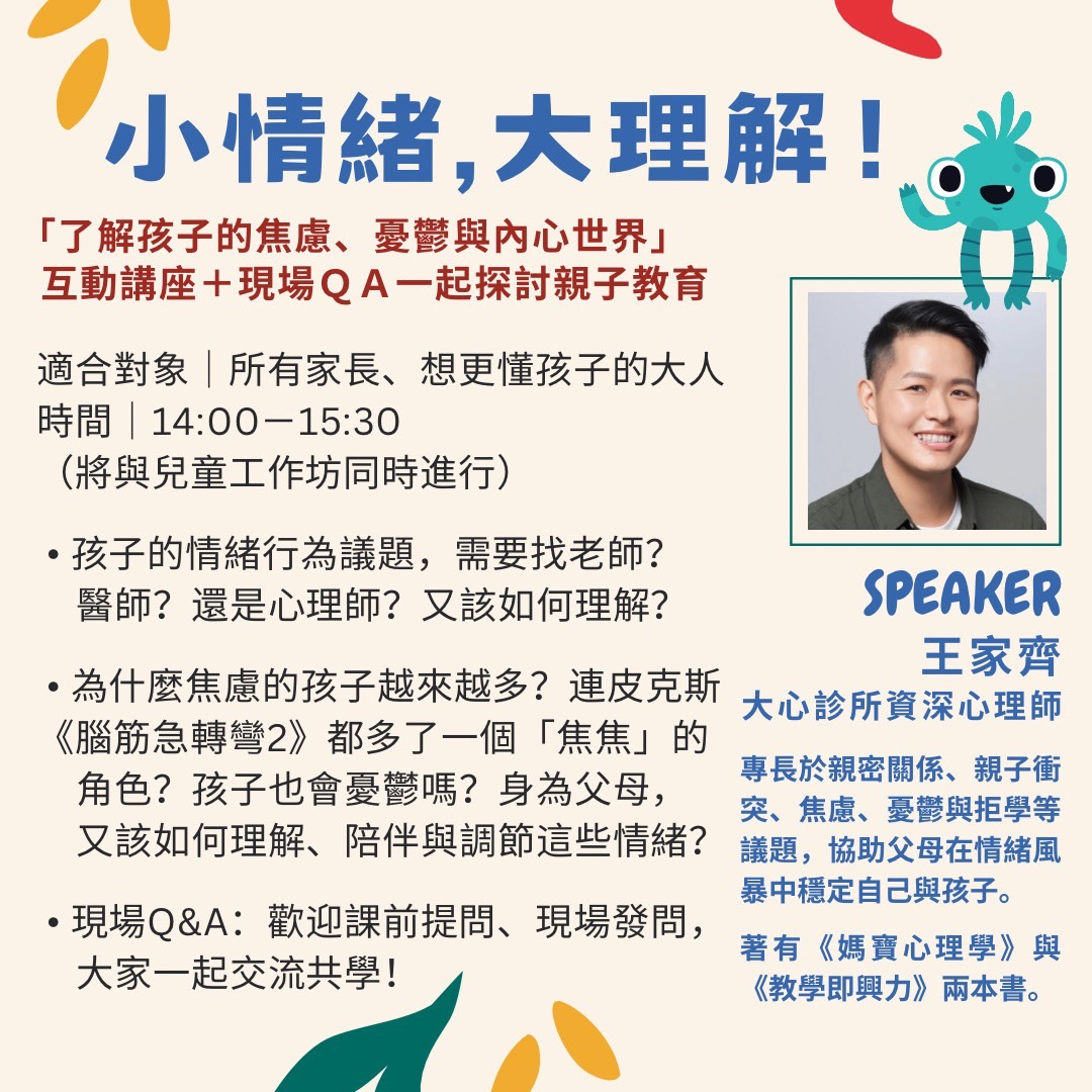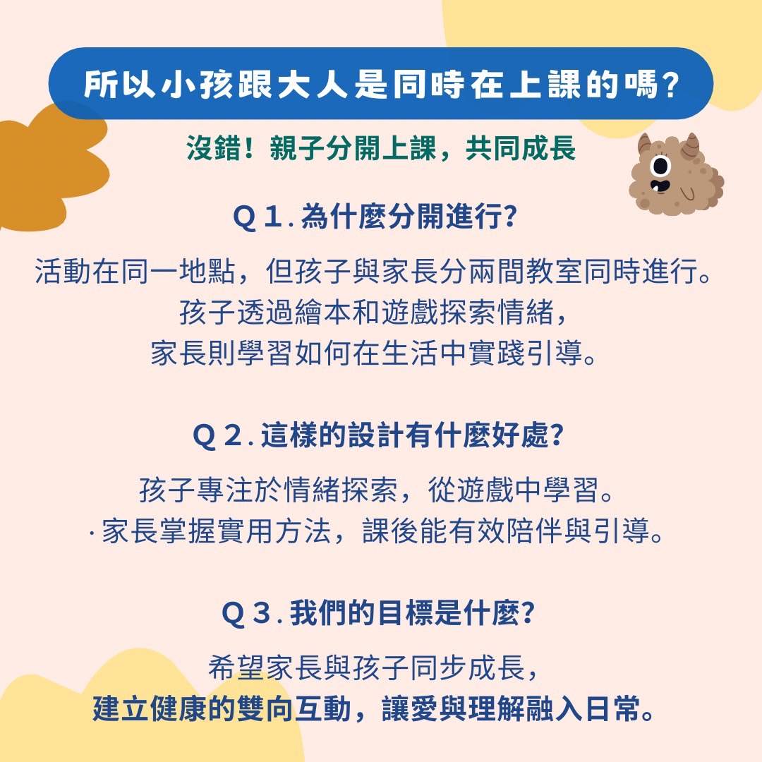 這是一場專為親子設計的雙重體驗活動,孩子透過故事、遊戲與音樂探索情緒,而家長則在心理師的帶領下,學習如何理解孩子的情緒,提升親子溝通能力,形成更健康的雙向互動。