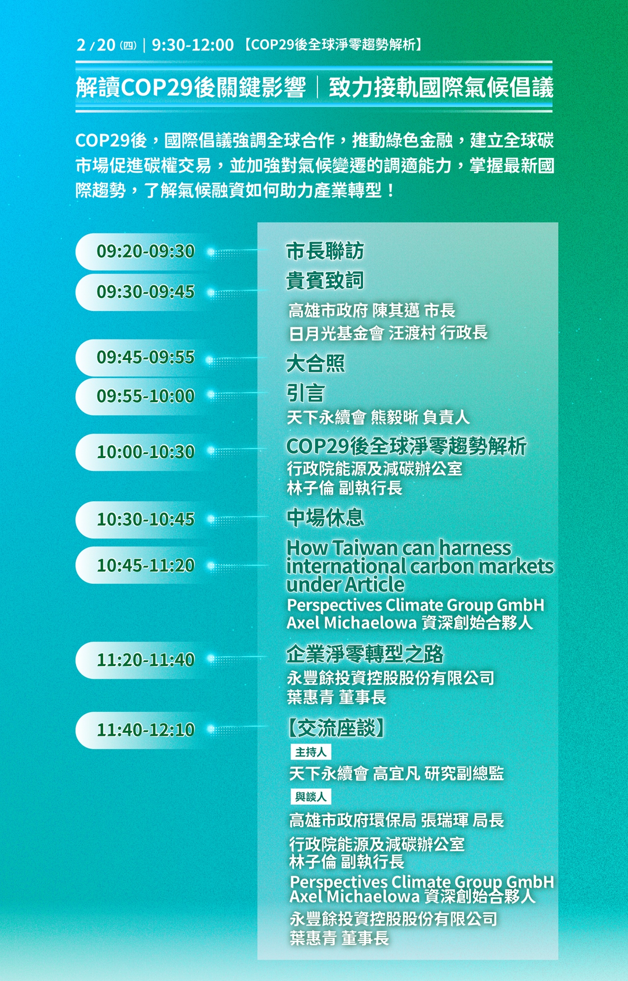 從COP29全球氣候峰會的重要決議出發,深入探討綠色金融的創新應用,以及產業龍頭分享循環經濟的實踐經驗,最後聚焦碳捕捉再利用的前瞻技術,網羅該領域的領導企業與權威專家,為您帶來最新、最實用的淨零轉型知識!