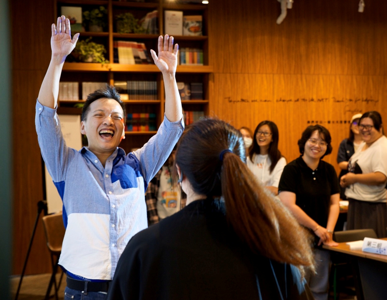 教學所到之處,總是充滿笑聲,讓同仁們在歡樂中,引發學習動機。無論是工作坊或是講座,都能透過各式各樣的即興體驗活動,讓大家動起來。不只是抒解壓力,還能提升自我覺察與擴大感官,並在團體中感到滿滿地朝氣與動能。