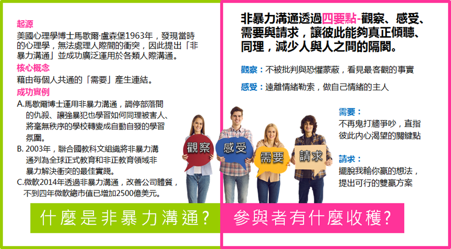 「非暴力溝通」由美國的心理學博士馬歇爾•盧森堡所提出,其概念是藉由每個人共通的需要產生連結,並透過觀察、感受、需要與請求等步驟,讓彼此能夠真正傾聽、同理,減少人與人之間的隔閡。目前在世界各地,已有許多組織進行推廣,並應用在人際關係、團隊合作、教育現場等主題。