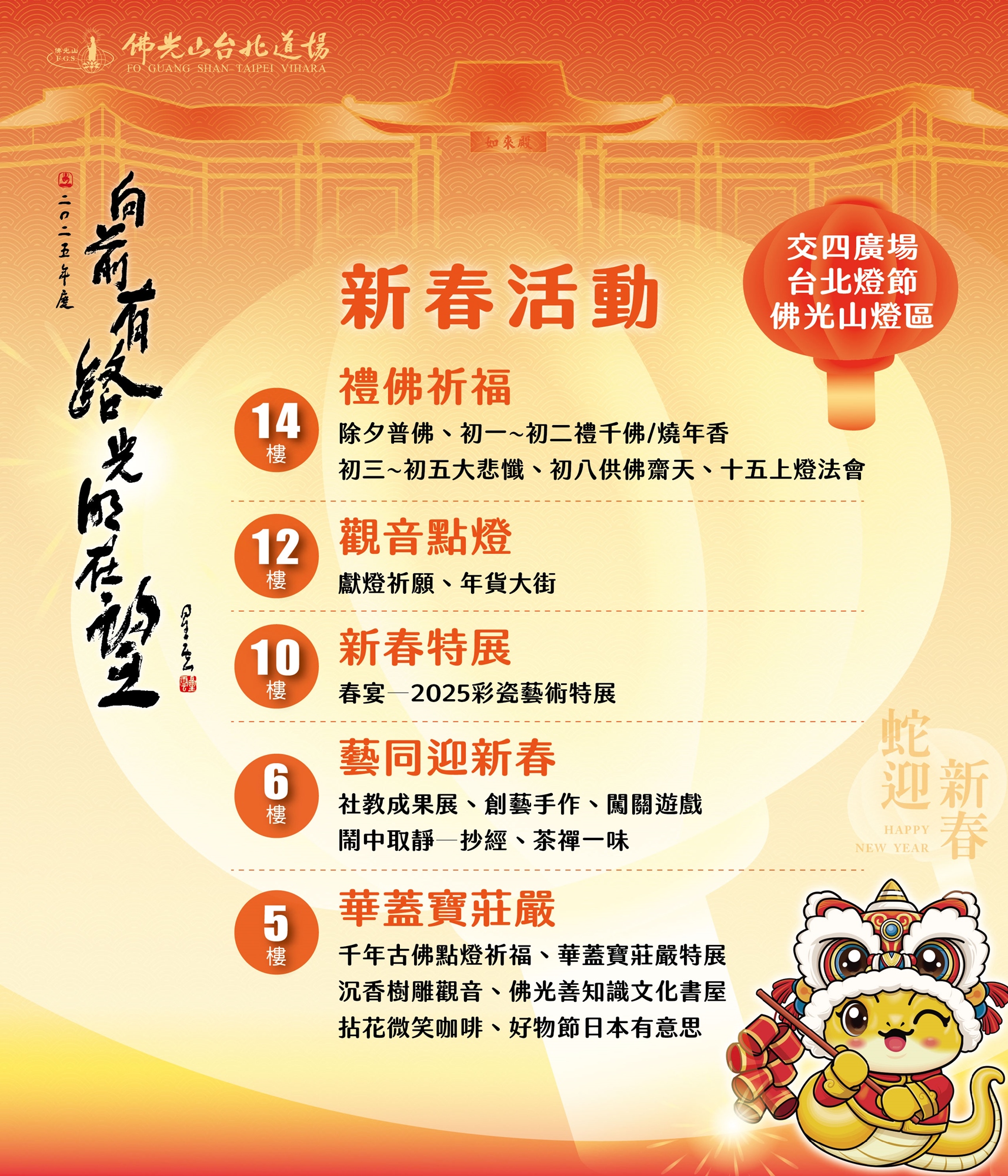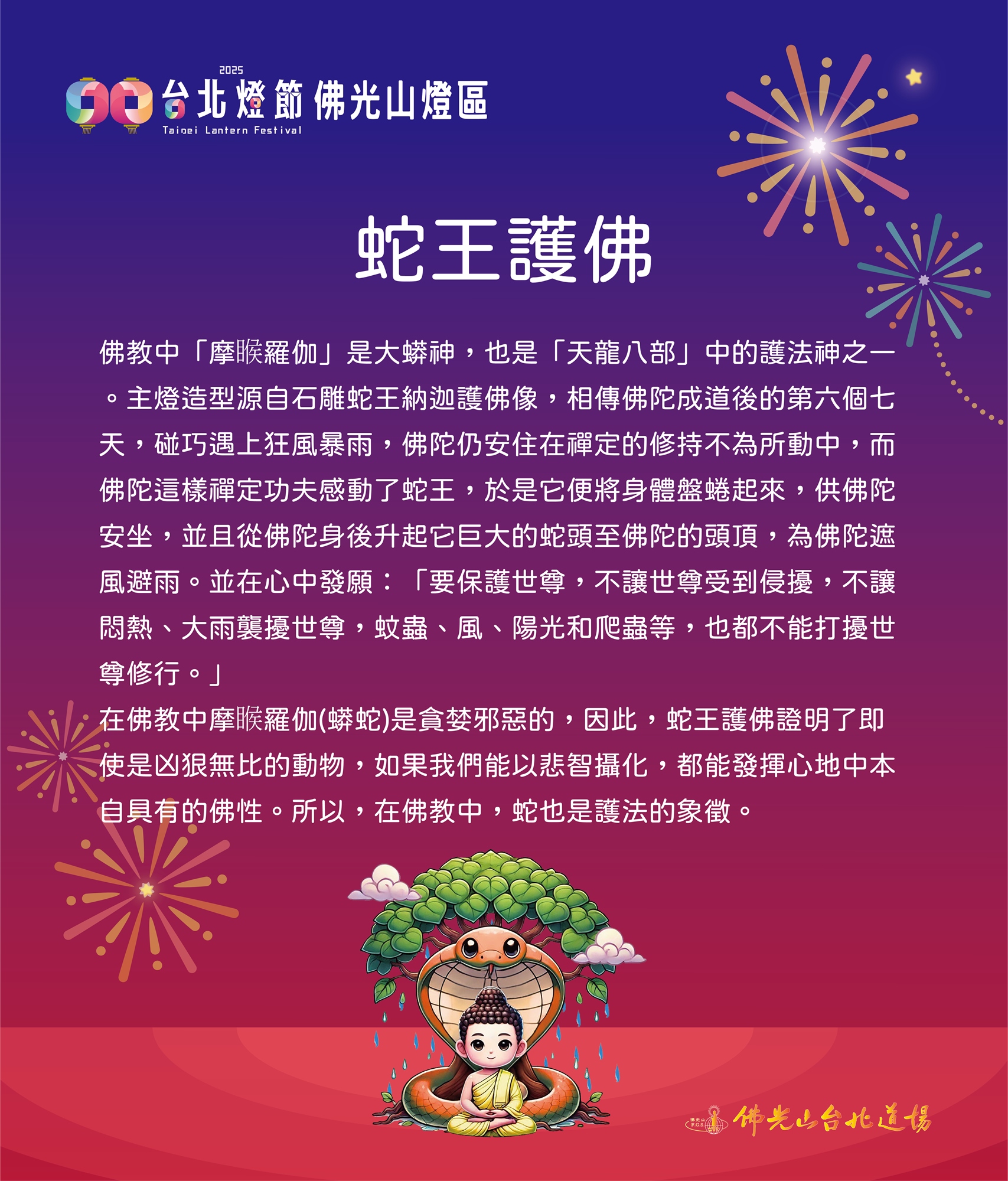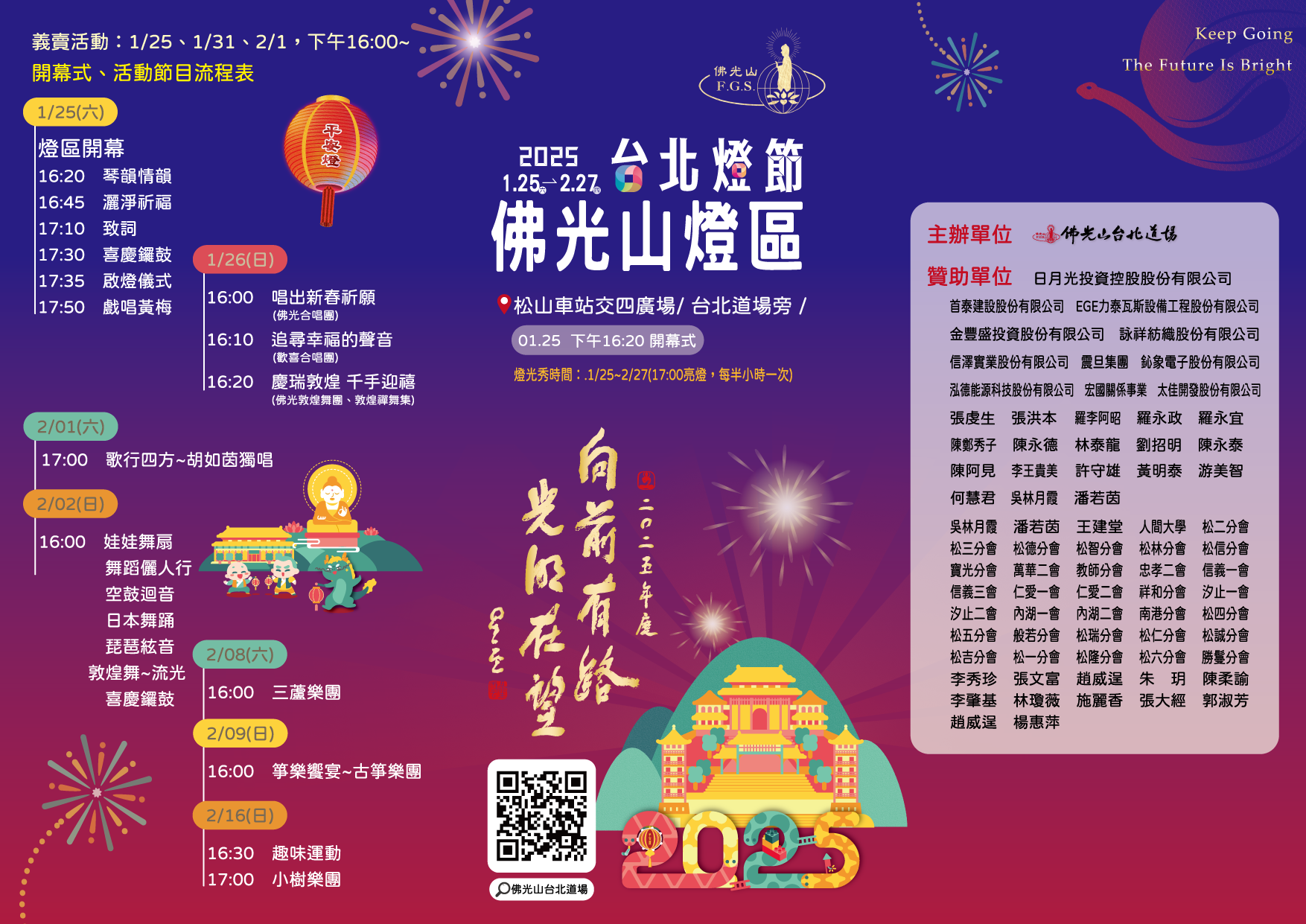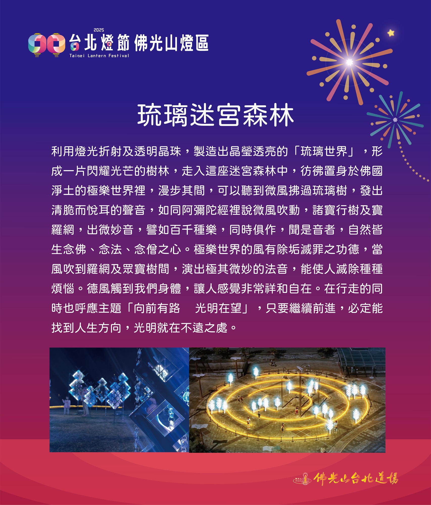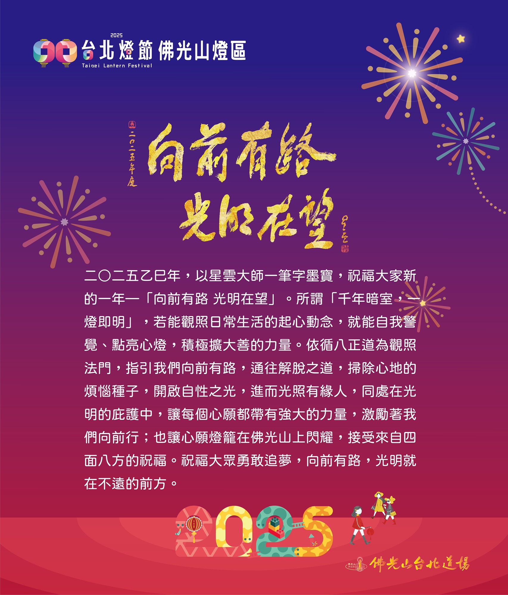 佛光山自民國69年起每年於新春期間啟建春節平安燈會,邀請民眾在迎接農曆年時,闔家祈福許願,祈求新的一年能好運到來、吉祥平安。佛光山的平安燈會自早期的傳統造型及至近年來現代造型,總是能給參訪民眾新的體驗和驚喜,此次擬藉著精心規畫製作的造型花燈,參與台北燈區系列的展出,響應「2025台北燈節」傳遞溫暖、善美的、淨化人心的意念。