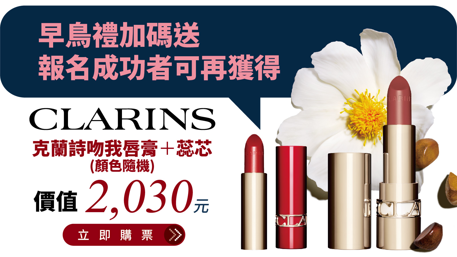 報名早鳥優惠票成功者可再獲得Clarins克蘭詩吻我唇膏+蕊芯(顏色隨機)價值$2,030